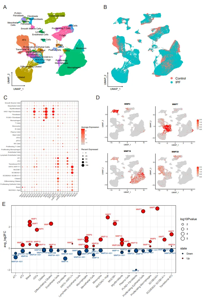 Many previous studies have demonstrated the important role of the MMPs, but most of them have been limited to the tissue sample and therefore may not explain the corresponding cell type specificity. In this study, we obtained 31 major lung cell populations from GSE135893 (A) and screened only the single cell sequencing of normal and IPF patients (B). MMP2 tends to be highly expressed in mesenchymal cells (C). As shown in D, MMP7 is specifically expressed in basal cells and secretory cells, and MMP19 highly expressed in macrophages, in line with our previous prediction based on TNF signaling pathway, and MMP28 expressed in epithelial cells and endothelial cells, which may directly affect the formation of epithelial barrier and the remodeling of alveolar structure. Subsequently, we focused on the abnormal expression of MMPs in the disease state. MMP7 has been recognized to be upregulated in the lung tissue of IPF patient. The profiling of MMPs in single cell demonstrated that MMP7 was indeed highly expressed in most cell types and MMP24 was much lower in all cell types of IPF lung tissues (E), suggesting that more attention shoule be paid to the role of MMPs antisense RNA in the pathogenesis of IPF. The single cell sequencing data provide a rational interpretation of the unstable expression of MMP19 at the lung tissues, and MMP19 in myofibroblasts and macrophages of IPF patients is obviously upregulated, but the expression of MMP19 in PLIN2+ fibroblasts is downregulated.