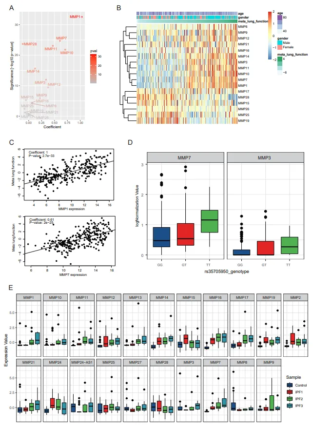 . MMPs were associated with clinical features. (A) The scatter plot shows the multivariate regression coefficients (X-axis) and the −log10Pvalue (Y-axis) for MMPs with meta lung function. (B) The heatmap illustrates the expression of MMPs and distribution of age, gender, meta lung function in cohort. (C) The scatter plots show the positive correlation of MMP1 and MMP7 with meta lung function. (D) The boxplots show the expression of MMP3 and MMP7 among different MUC5B genotypes. (E) The boxplots show the correlation between MMPs and lung surface density.