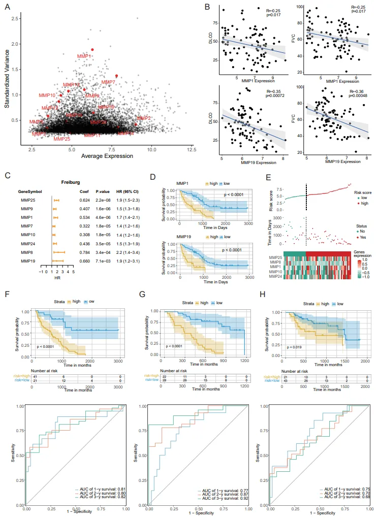 . MMPs indicated the progressing of IPF pathgenesis. (A) The scatter plot shows the average expression (X-axis) and the standardized variance (Y-axis) for MMPs in IPF. (B) The scatter plot shows the expression (X-axis) and DLCO or FVC (Y-axis) for MMP1 and MMP19 in IPF. (C) The forest plot displays the univariate Cox regression analysis results of the risk score and clinical factors with OS. (D) Kaplan–Meier OS curve for high- and low-risk groups differentiated according to MMP1 or MMP19 expression in Freiburg cohort. The assessment of difference was achieved by log-rank test. (E) The association of high-risk score with MMPs and prognosis of IPF patients. The distributions of risk score (top), OS status (median) and MMPs expression (bottom) in the IPF. (F**–**H) Kaplan–Meier OS curve for high- and low-risk groups (top). MMPs-related risk prognostic model in Freiburg (F), SIENA (G), LEUVEN (H). Receiver operating characteristic curves (ROC curves) for the 1-, 2-, and 3-year OS periods (bottom). MMPs-related risk prognostic model in Freiburg (F), SIENA (G), LEUVEN (H).