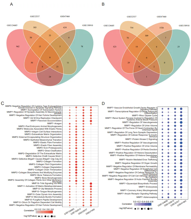 . Involvement of MMPs signal pathways enrichment analysis. (A) The Venn plot shows the overlap of biological pathways positively corelated with MMPs in GSE32537, GSE124685, GSE47460, GSE150910 respectively. (B) The Venn plot shows the overlap of biological pathways negatively corelated with MMPs in GSE32537, GSE124685, GSE47460, GSE150910 respectively. (C) The bubble plot shows biological pathways positively corelated with MMPs in GSE32537, GSE124685, GSE47460, GSE150910 respectively. (D) The bubble plot shows biological pathways negatively corelated with MMPs in GSE32537, GSE124685, GSE47460, GSE150910 respectively.