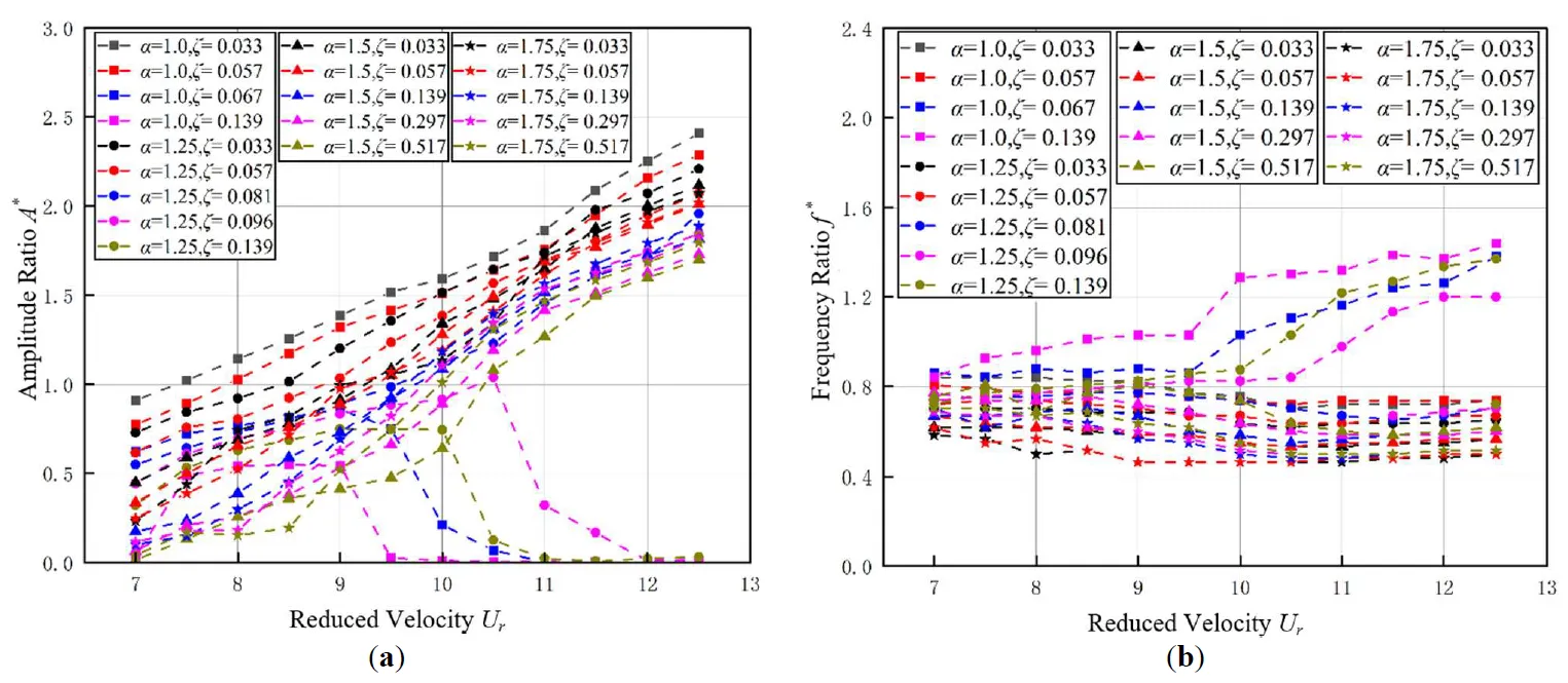 24] conducted FIM experiments on two rigidly coupled triangular prisms in tandem arrangement. The experimental results indicate that the “sharp jump” phenomenon may appear at specific spacing ratios. Ran et al. [