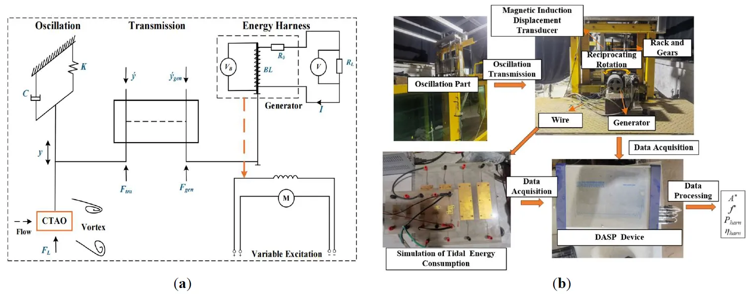 The oscillation part is connected to the variable excitation generator through the rack and gears. When the oscillator vibrates, the rack and gears convert the linear reciprocating rotation, which drives the generator rotor to cut magnetic lines to generate electric energy and transmit it to the load resistance to simulate the consumption of tidal energy. The system damping ratios can be changed by a controllable magnetic damping system. The amplitude and frequency are collected by the transducer in real-time and transmitted to the data acquisition & signal processing (DASP) device in the form of electrical signals.