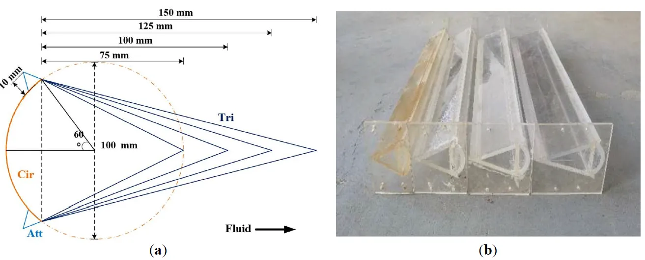 In this experiment, the CTAO is selected, and its section consists of a partial circle, a large triangle and two smaller triangles. Plexiglass end-plates with a thickness of 0.01 m are added to both ends of the oscillator to weaken the influence of boundary conditions on oscillation. The attached plate, also 0.01 m, is positioned at a circumferential angle of 60°. Additionally, the oscillator is designed with a hollow interior to facilitate weight adjustment, and four different aspect ratios are tested: