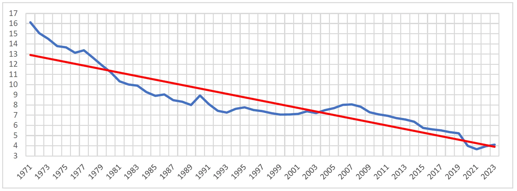 . Percentage of autopsies (blue) in relation to all deaths in Poland in subsequent years in the period 1971–2023 and trend line (red).