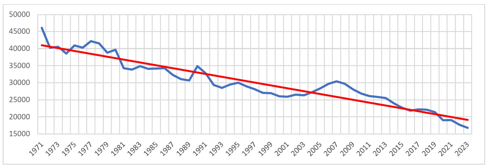 . The number of autopsies (blue) in Poland in subsequent years in the period 1971–2023 and trend line (red).