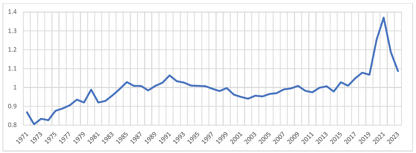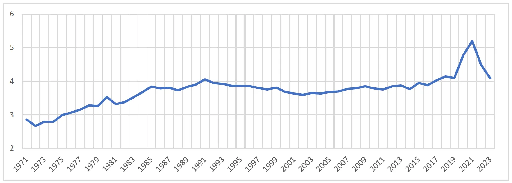 . Percentage of deaths in relation to the total population in Poland in subsequent years in the period 1971–2023.