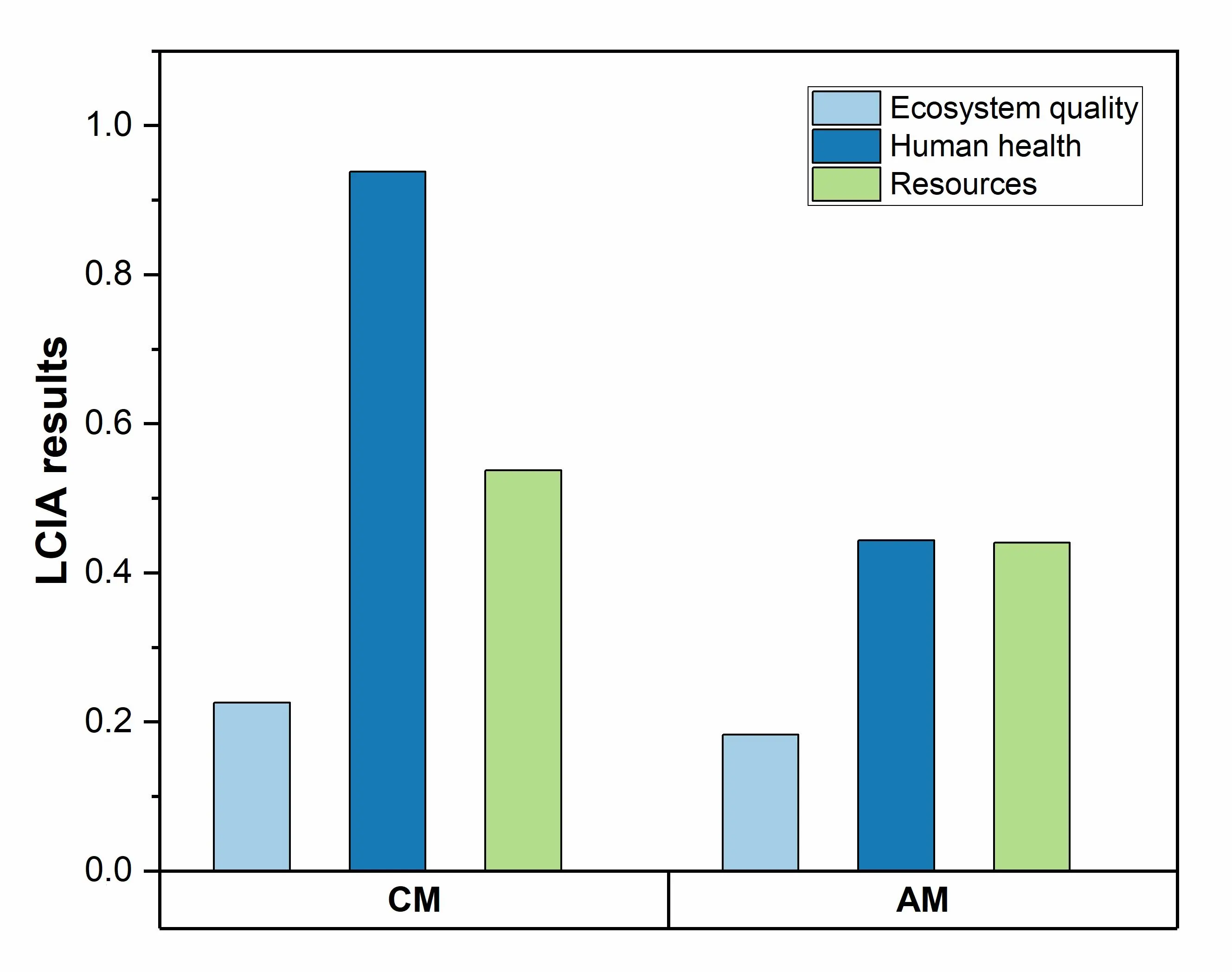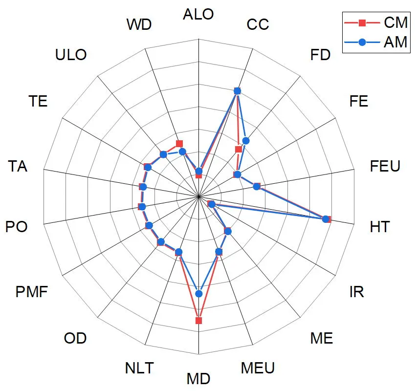 ReCiPe 2016 midpoint impact results of the tensile specimen produced by CM and AM.