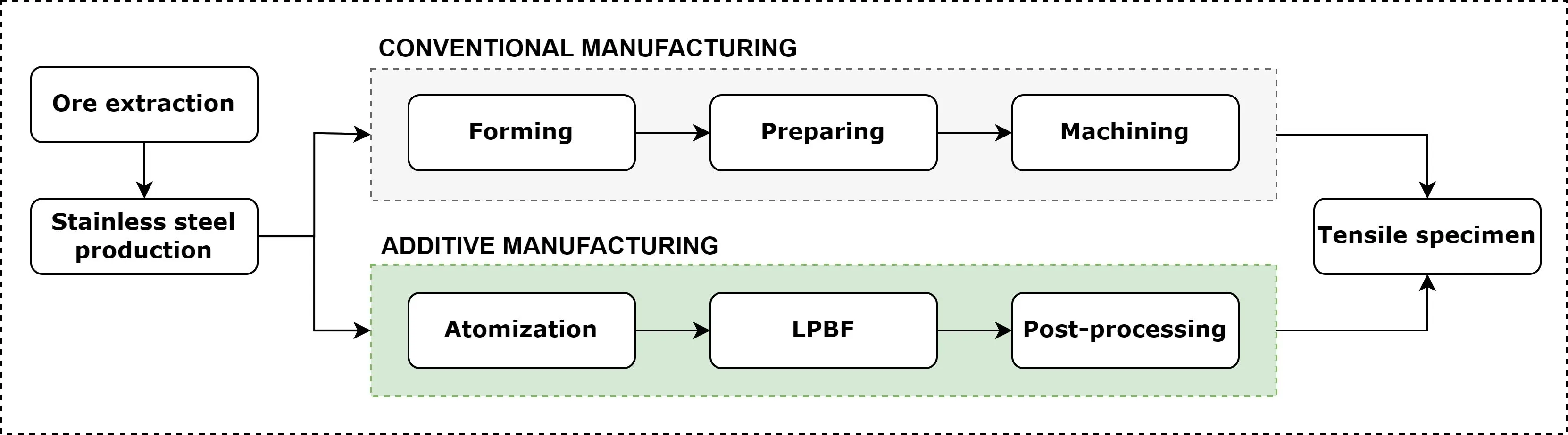 Scope Articulation: The product system evaluated is the tensile specimen (256 g). The product system is depicted in . The system boundaries include processes from material production (ore extraction and stainless steel production). Two product systems were considered: (1) Conventional manufacturing (CM) and (2) Additive manufacturing (AM). The unit process for CM considers forming, preparing, and machining, described in more detail in Section 2.3.2. Meanwhile, the AM process involves powder atomization, laser powder bed fusion processing (LPBF), and post-processing. Collection and transportation of steel scrap and post-manufacturing steps such as transportation of products from the mill to the end user and maintenance and end-of-life management of test specimens were not part of the analysis.