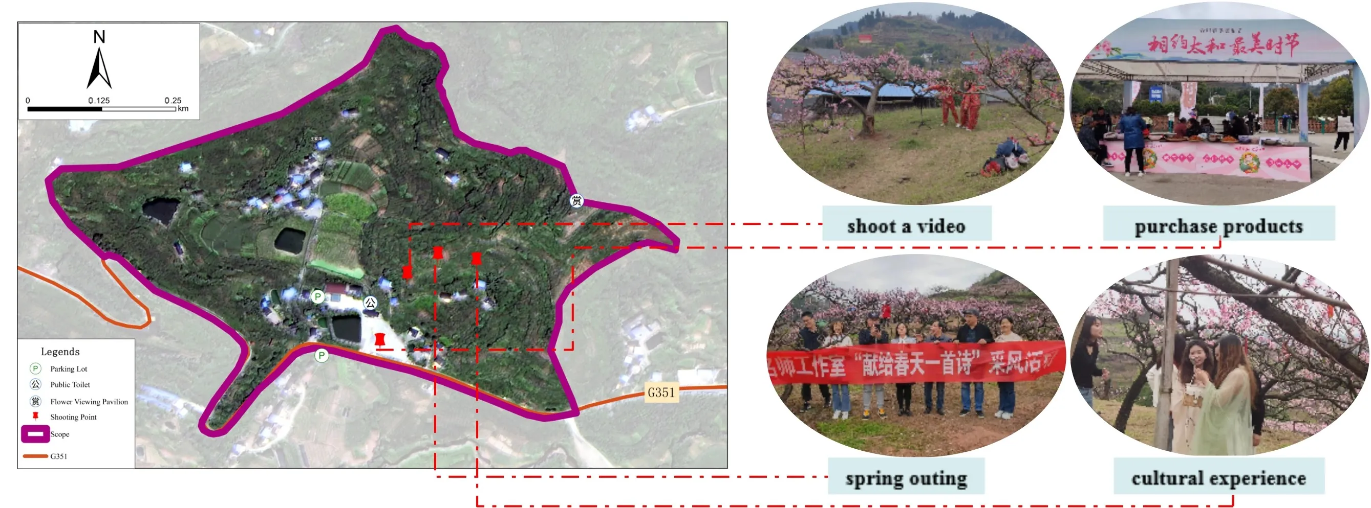 We chose the peach blossom festival in Taihe Town as a research case for this study for four major reasons. First, the festival has a long history. As of 2023, 16 peach blossom festivals have been organized, bringing about 100,000–200,000 RMB income to fruit farmers annually during the flowering period. It is a typical example of the flower-viewing economy derived from the transformation of traditional mountain agriculture in China’s mountainous regions. Secondly, Tingzi Village has agriculture as its historic primary industry, adopting the development mode of “village community + cooperative + fruit farmers” and the development strategy of “Agriculture + E-commerce + Tourism”. In mid-March yearly, the Peach Blossom Festival Tourist Card Route is launched, creating the “Agricultural Products + Food + Cultural Creation” Square Bazaar to experience the peach blossoms, browse the bazaar, explore the food, and watch the program. These have remarkable effects on increasing entrepreneurship and income.