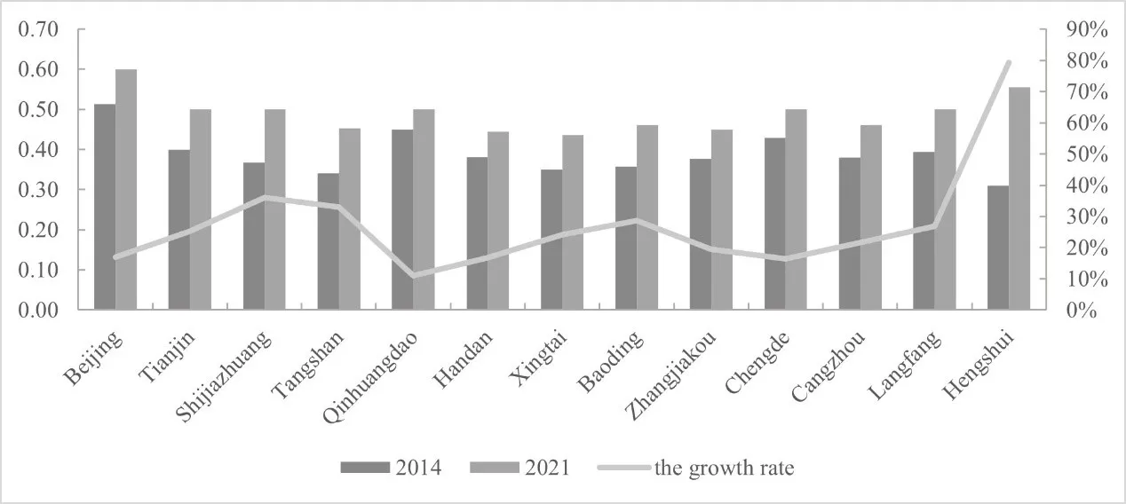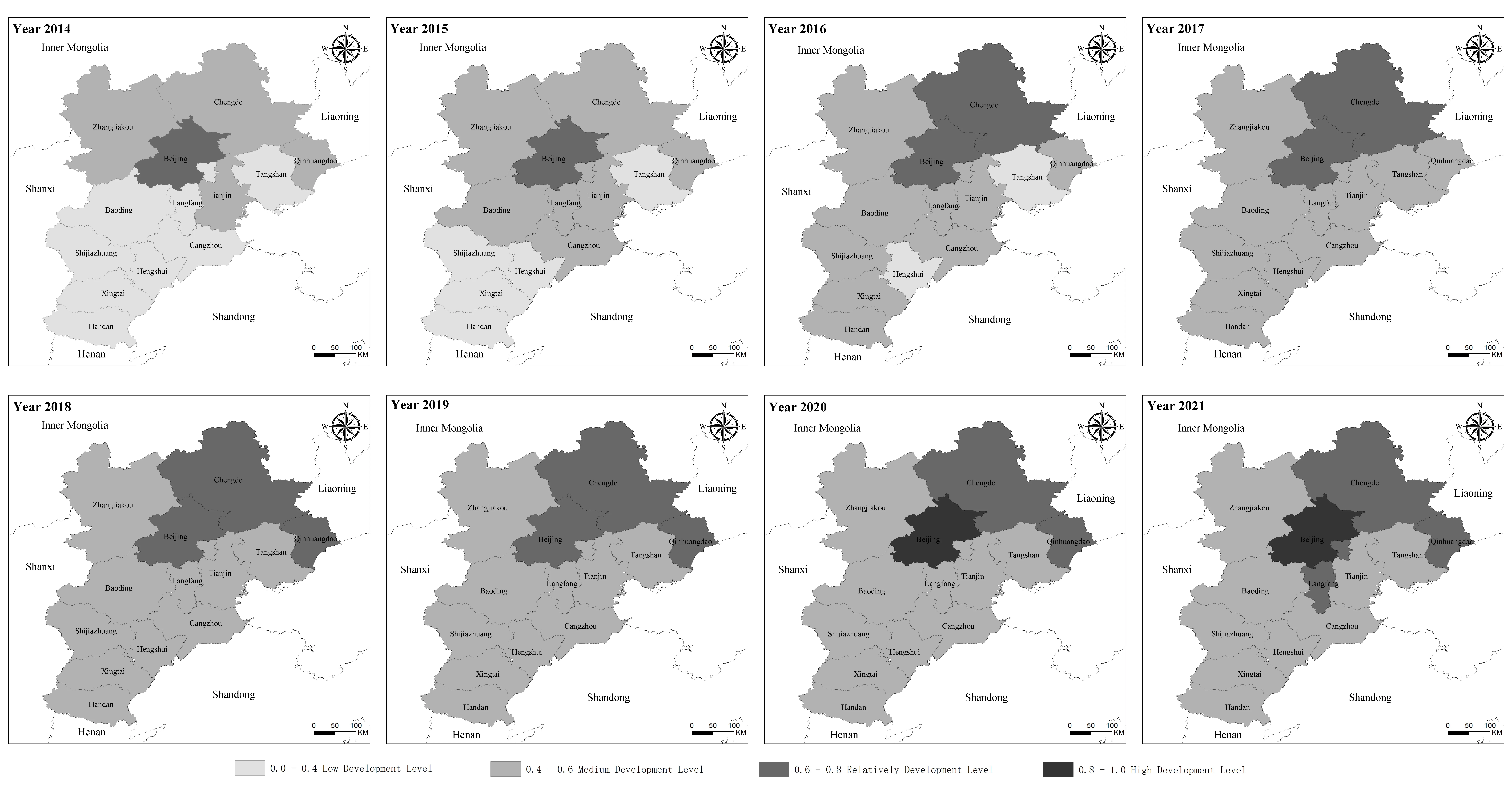 30]. In the background of HHN construction, President Xi Jinping (2014) pointed out that the Beijing-Tianjin-Hebei collaborative development was necessary to explore an effective path for HHN construction and to promote the coordination of population, economy, resources and environment. The coordinated development of Beijing-Tianjin-Hebei is an effective way to explore the construction of HHN, as well as an important carrier to promote the coordination of population, economy, resources and environment. To date, there are relatively few studies on the evaluation of the comprehensive development level of HHN in the Beijing-Tianjin-Hebei urban agglomeration and the coordination among various dimensions. Based on the existing research on HHN construction, compared with the social, economic and human factors, this study paid more attention to ecological factors. And constructed an HHN comprehensive evaluation index system for the Beijing-Tianjin-Hebei urban agglomeration, analyzed the changes in the comprehensive development level of HHN, the spatio-temporal differences and the change rules of the coordination degree from 2014 to 2021. Meanwhile, this study analyzed the development process, mode and status quo of each city in the Beijing-Tianjin-Hebei urban agglomeration in recent years, as well as the problems encountered, and then provided references for the future construction and development of China’s HHN ().