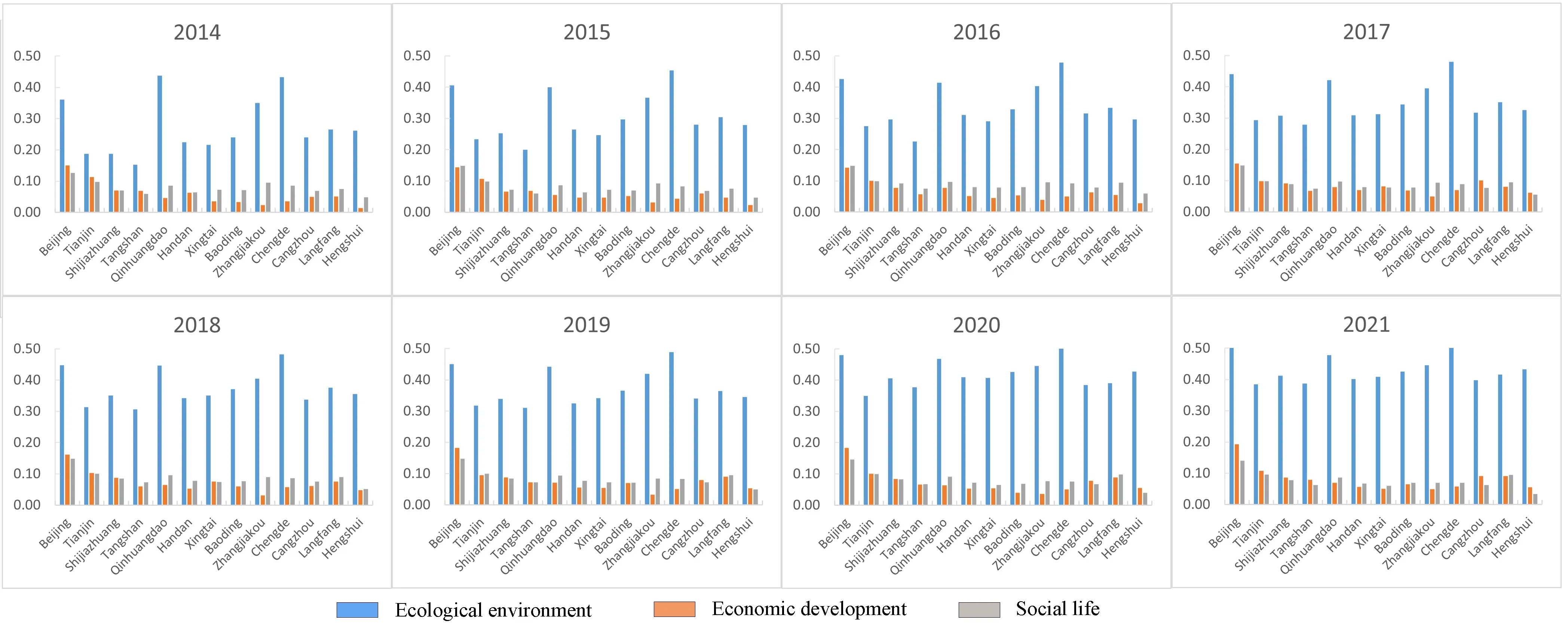 The ecological and social data of the Beijing-Tianjin-Hebei region from 2015 to 2022 were extracted from the China City Statistical Yearbook, Beijing Statistical Yearbook, Tianjin Statistical Yearbook, Hebei Economic Yearbook, the official website of the National Bureau of Statistics, the Statistical Bulletin of National Economic and Society Development and Statistical Yearbook of the corresponding year on the website of each prefecture-level city government, Columbia University Center for Socioeconomic Data and Application, and China Air Quality Online monitoring and analysis platform. A few missing data of some individual indicators were updated by using the Kriging method based on data from the adjacent years.