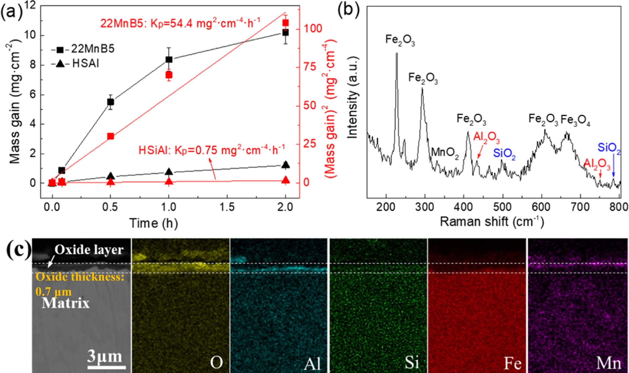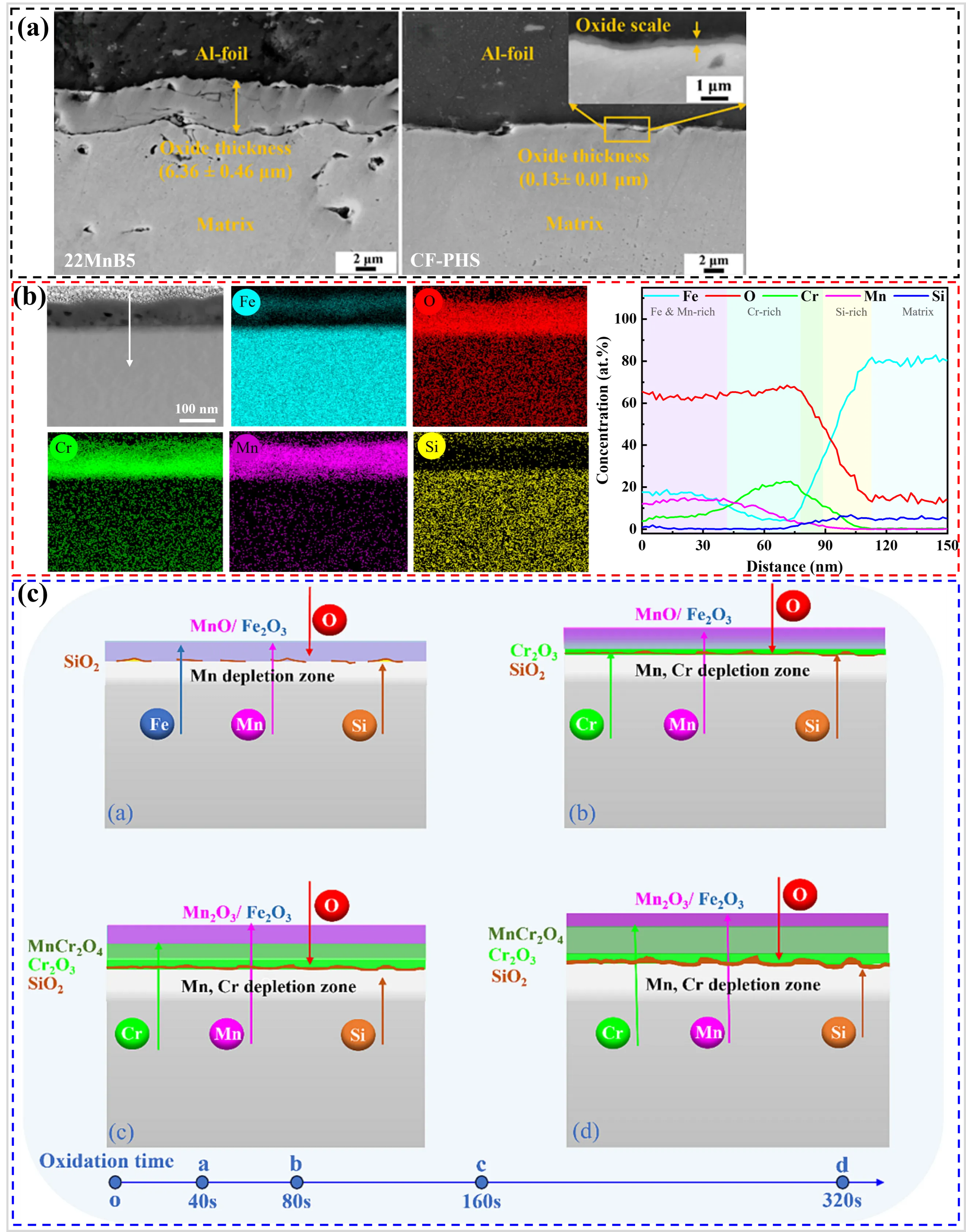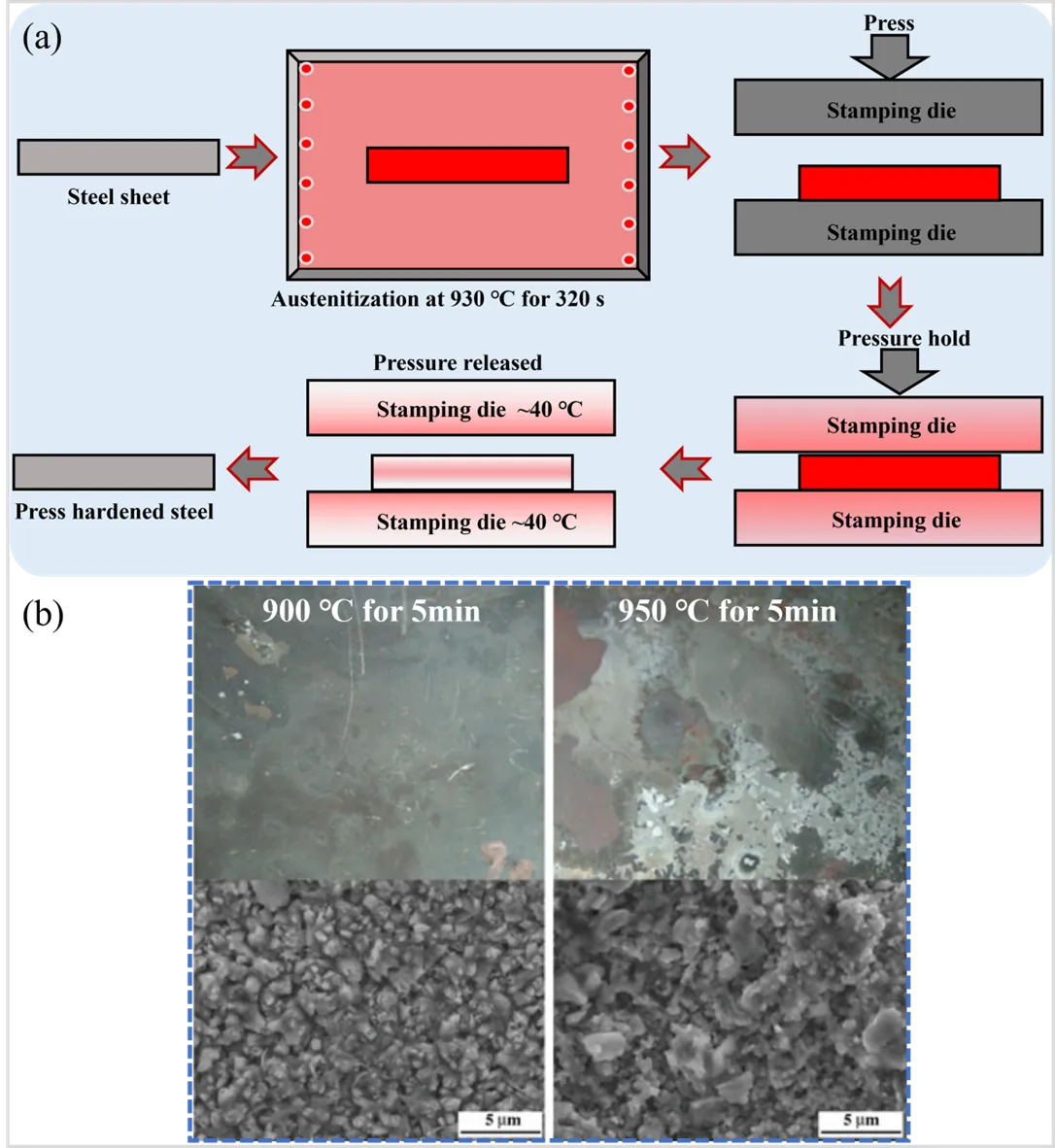 3) to safeguard the steel plate during the austenitizing stage, oxygen infiltration from the external atmosphere remains unavoidable. From b, it can be seen that a thick and easily peelable oxide layer formed on the surface of the Mn-B bare sheet (e.g., 22MnB5) after hot stamping, indicating that severe high-temperature oxidation inevitably occurred during hot stamping [