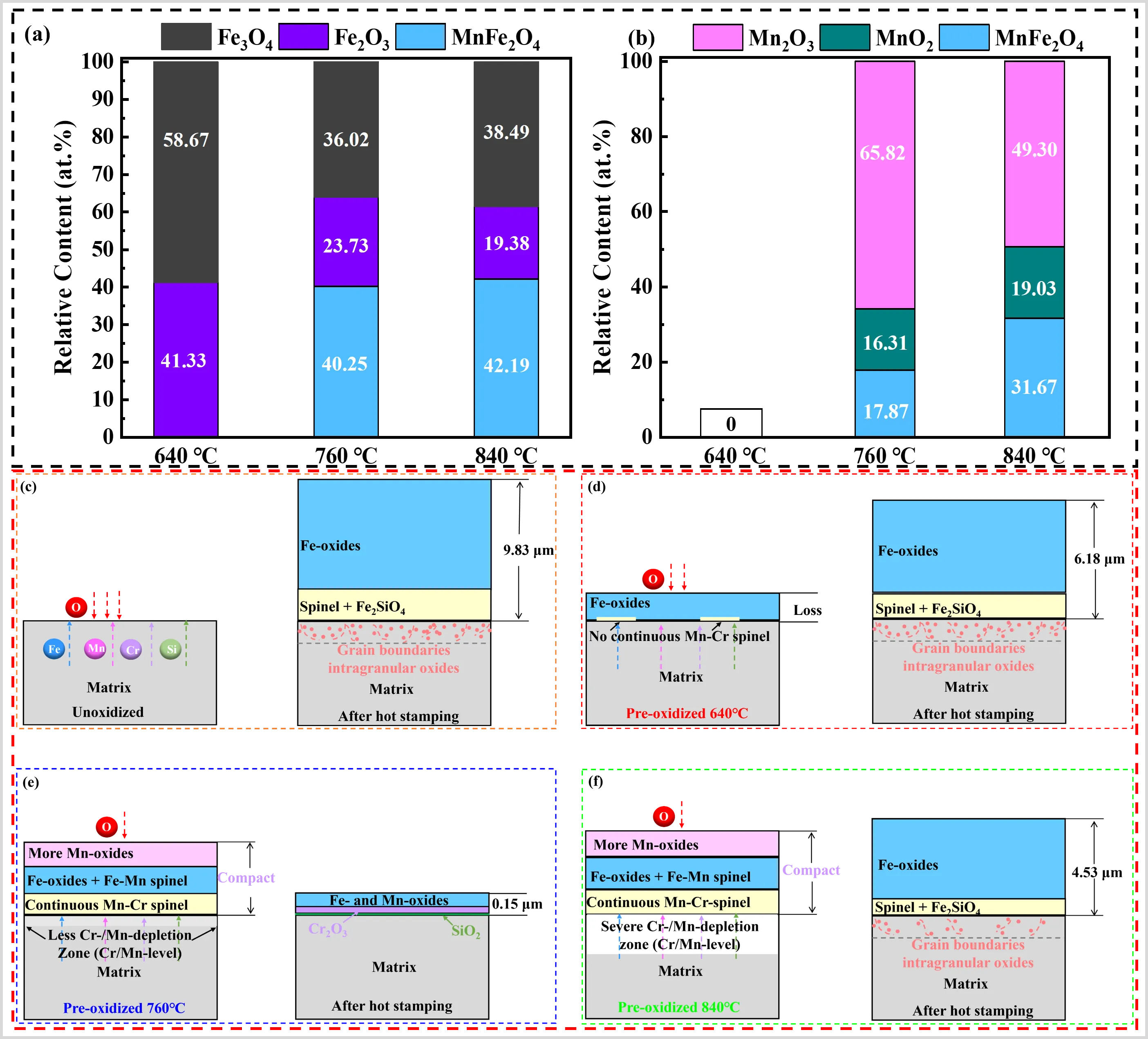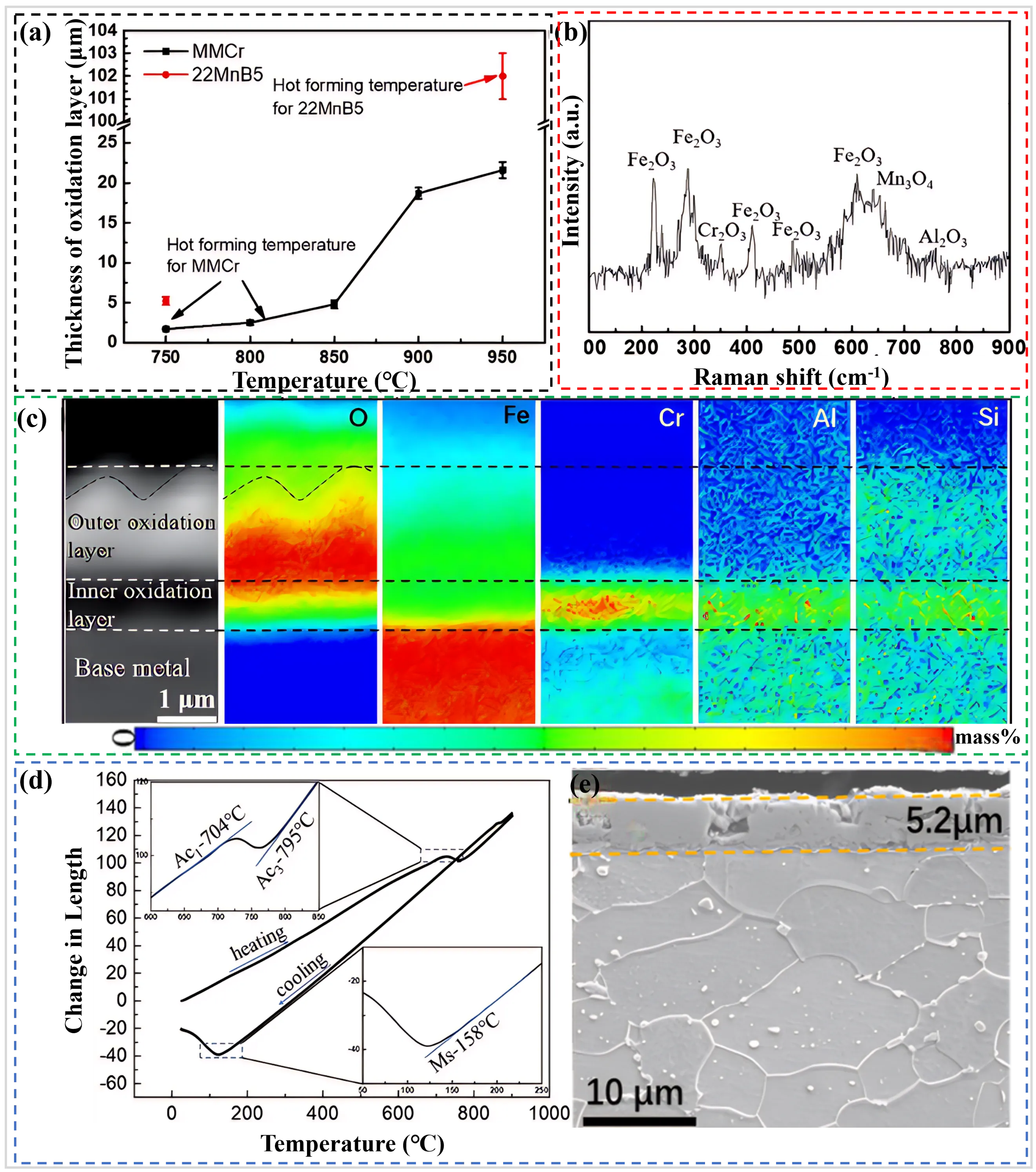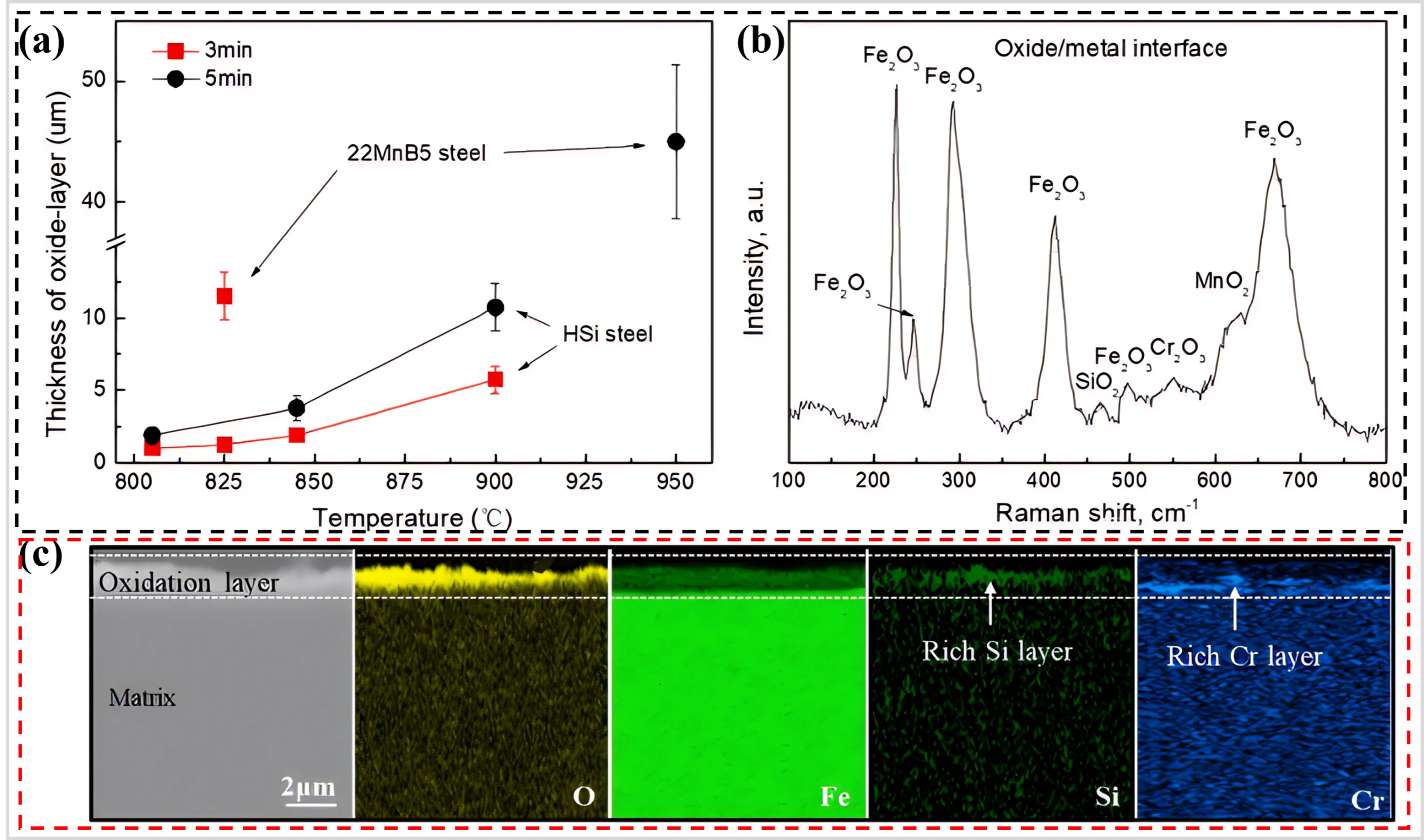 3) to safeguard the steel plate during the austenitizing stage, oxygen infiltration from the external atmosphere remains unavoidable. From b, it can be seen that a thick and easily peelable oxide layer formed on the surface of the Mn-B bare sheet (e.g., 22MnB5) after hot stamping, indicating that severe high-temperature oxidation inevitably occurred during hot stamping [