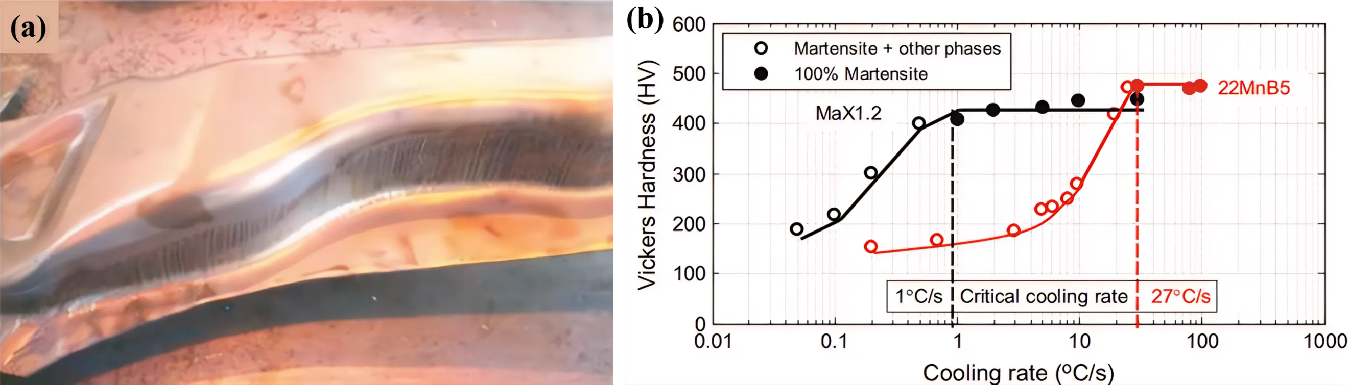 28]. In addition, due to the highly oxidized nature of the 22MnB5 sheet, its hot stamped parts must be shot peened before entering the automotive assembly plant for subsequent welding and painting processes, which further elevates production costs. Initially, 22MnB5 PHS are carbon (C–) and manganese (Mn–) alloyed steels with small amounts of boron (B–) added for hardenability [