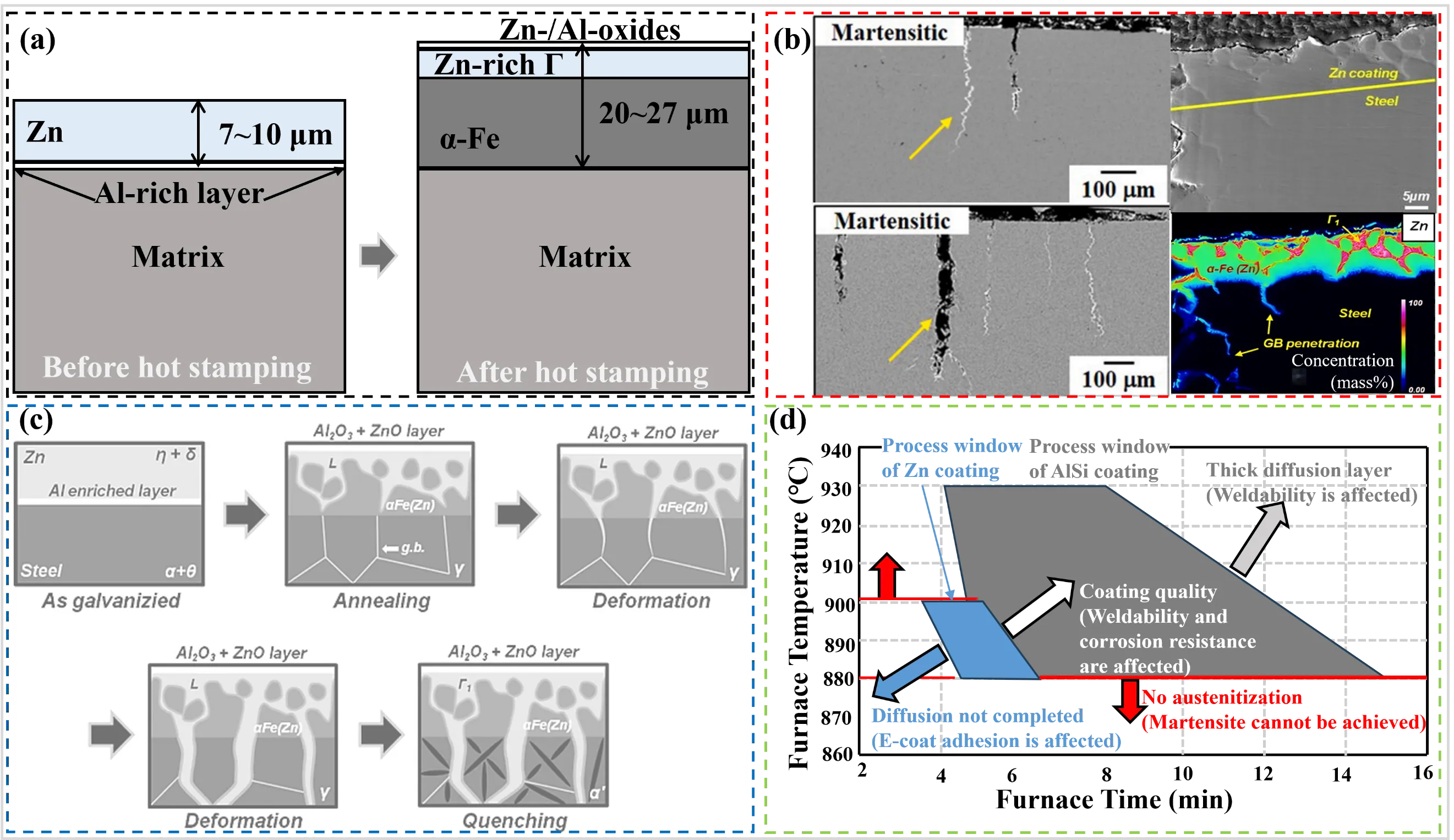 However, both thick and thin Al–Si coatings are unable to provide cathodic protection due to their very close electrochemical potential to the substrate. Consequently, Al–Si coated sheets offer only limited corrosion protection after hot stamping, and are primarily utilized in the dry area of the BIW [