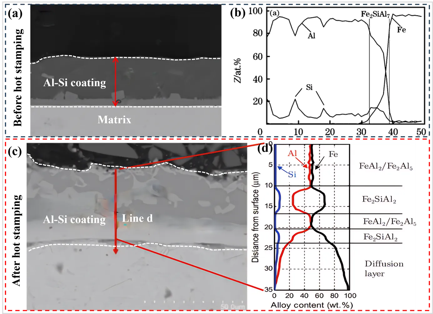 40]. c,d demonstrate the coating microstructure of the Al–Si coated sheet following austenitization (heat treatment at 930 °C for 6 min) and hot stamping. The final microstructure of the coating layer is primarily divided into five layers (with the outermost layer being the first): The initial and third layers are composed of FeAl
