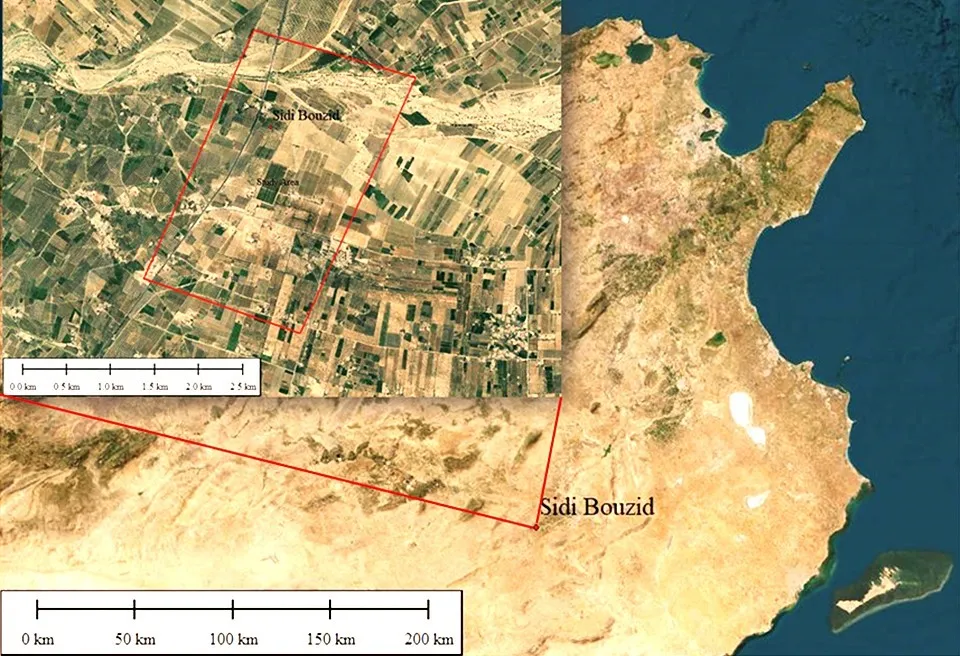 The study was conducted in Sidi Bouzid, Tunisia, a region characterized by a semi-arid climate with irregular rainfall patterns and significant agricultural challenges, including water scarcity and soil degradation. The selected area covers 4.78 km