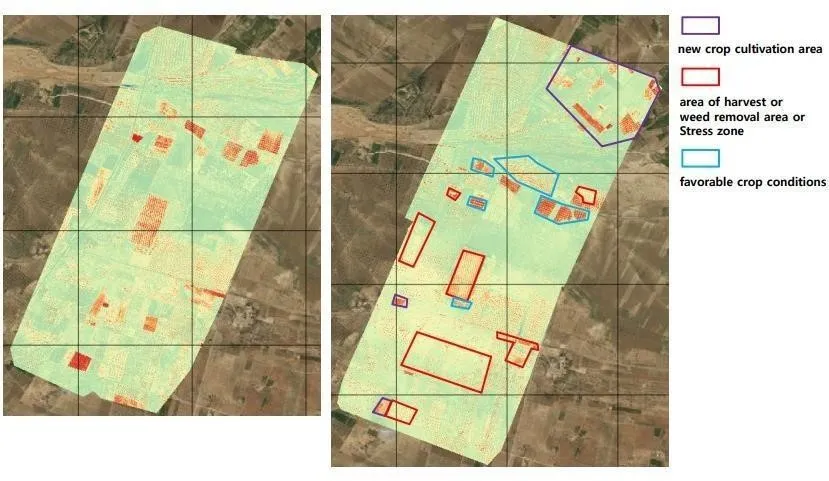 This index was used to assess crop health, identifying areas experiencing water stress, nutrient deficiencies, or disease.