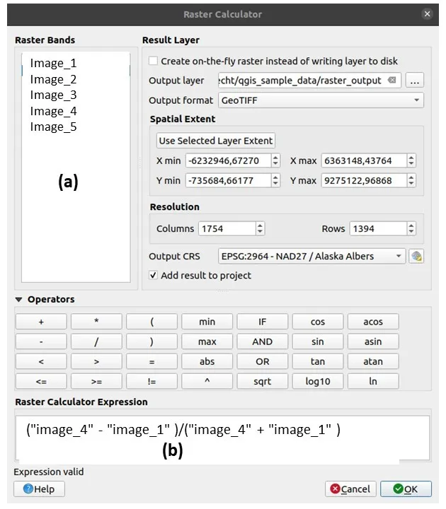 . NDVI calculation steps: band raster selection (<b>a</b>) and the NDVI equation (<b>b</b>).