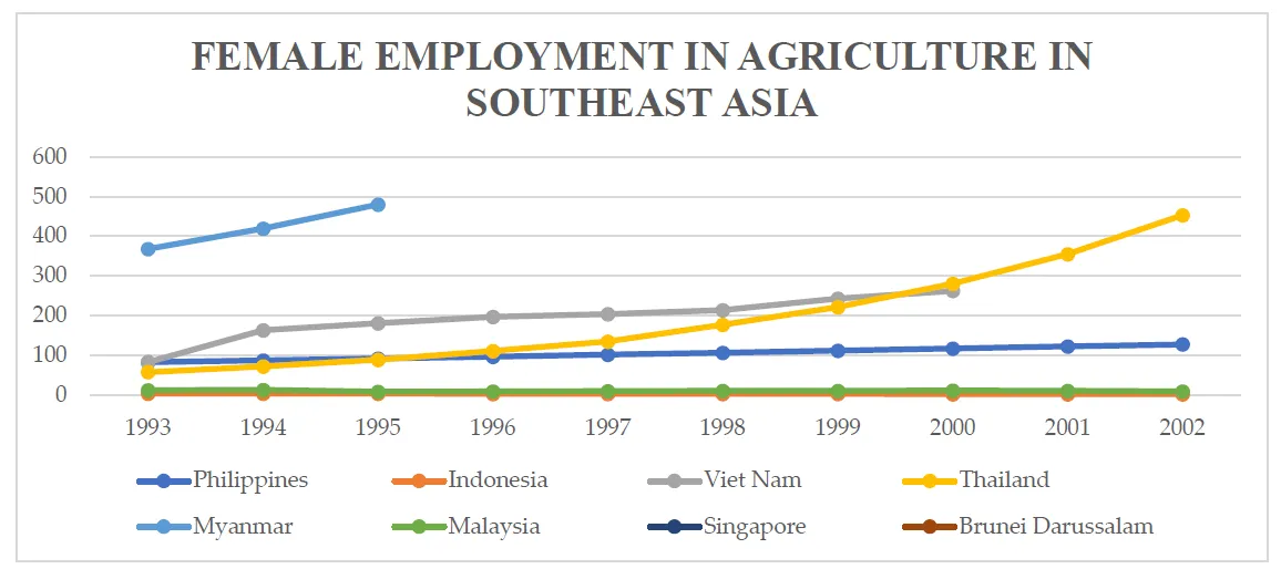 South and Southeast Asia were chosen for this study due to their strong dependence on agriculture, where a large share of the population relies on farming for livelihoods and economic stability. The region exhibits diverse gender employment patterns, with significant variations in male and female labor participation, making it an ideal setting to analyze their impact on agricultural productivity. Additionally, disparities in mechanization and fertilizer use across countries provide a unique opportunity to assess their role in enhancing efficiency. Policymakers in these regions are actively promoting agricultural modernization and gender-inclusive strategies, making the findings highly relevant for policy development. Lastly, the availability of comprehensive data enables a robust panel analysis, offering valuable insights into the complex interactions between gender-based employment, agricultural machinery, and fertilizers in shaping regional productivity. Moreover, other external factors affecting agriculture are excluded from the study, such as typhoons, floods, and natural hazards affecting Southeast and South Asia [