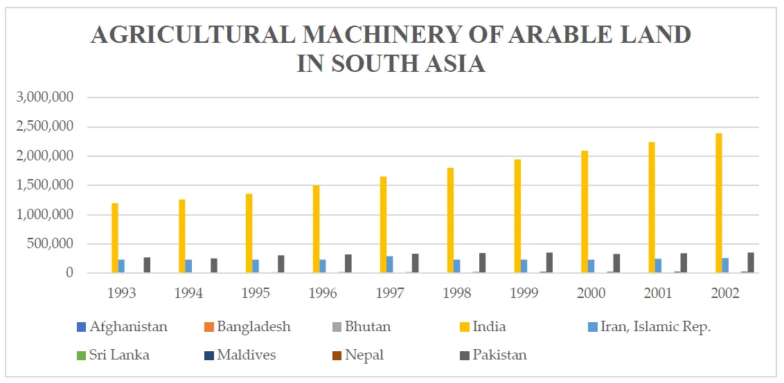 The relationship between agricultural machinery, fertilizer use, and productivity is well-documented, demonstrating their significant impact on agricultural output. However, despite productivity improvements, a disconnect remains between agricultural growth and rural poverty alleviation. Increased fertilizer use can lead to a 13–20% rise in GDP per capita due to higher agricultural yields. The adoption of modern agricultural machinery has also been shown to positively affect food grain production. For instance, in Pakistan, machinery and irrigation sources significantly contribute to agricultural output [
