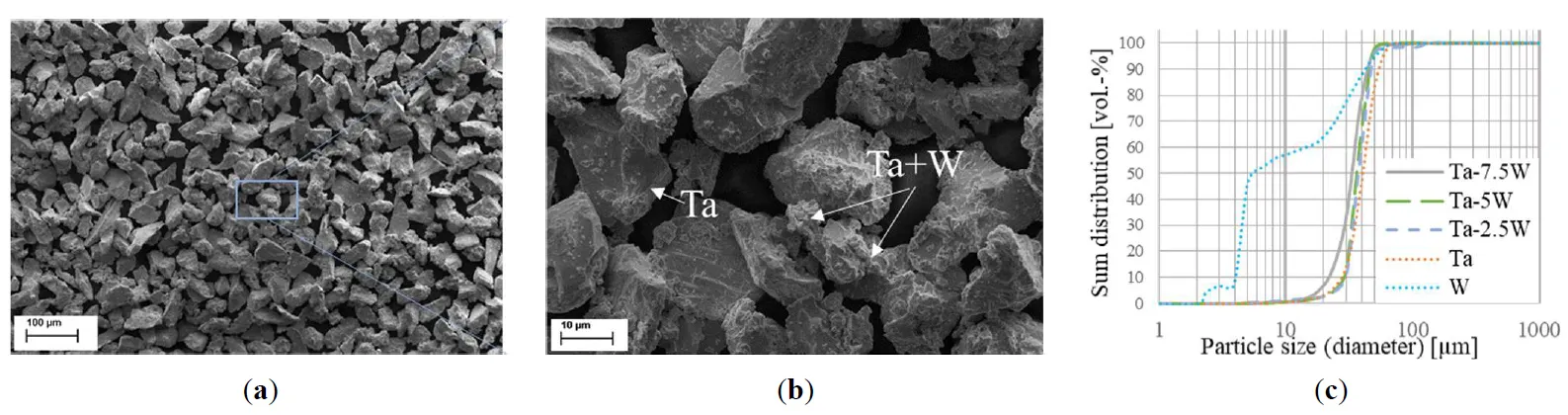 The initially rough surface and polyhedral particle morphology of the tantalum powder (a) changes during the mechanical alloying process, leading to fracturing and slight rounding of the powder particles as the corners are worn down due to pressure and abrasion. The milled powders are also characterized by submicron flakes from both materials, which adhere to larger particles and form occasional, randomly distributed agglomerates (b). Based on surface observations, it is assumed that partial cold-welding of the fine tungsten particles (around 10 µm) and mixed flakes takes place. As the tungsten content increases, the overall particle size decreases slightly (c), which can be attributed to the smaller size of the tungsten (<45 µm) and fractured particles compared to the Ta-base powder.