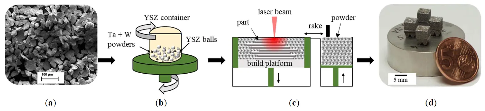 . Overview of key processing steps in this study: (<b>a</b>) Initial powder feedstock, schematic overview of the (<b>b</b>) mechanical alloying and (<b>c</b>) PBF-LB/M process applied in this study, (<b>d</b>) actual samples produced by the process (here: Ta reference).