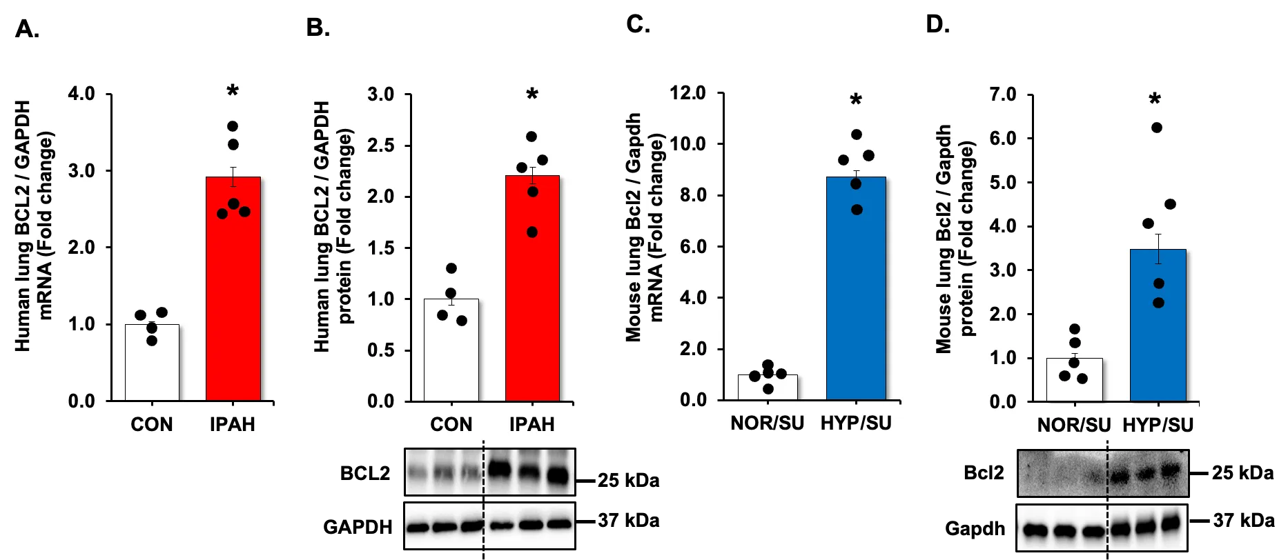 . BCL2 is increased in clinical and experimental PH samples. (<b>A</b>,<b>B</b>) Fail donor (CON) or idiopathic pulmonary arterial hypertension (IPAH) patient lungs were subjected to qRT-PCR and Western blots. <i>n</i> = 4–5. Densitometry with a representative blot and GAPDH loading control is shown in B. (<b>C</b>,<b>D</b>) Whole lung homogenates were collected from normoxic/sugen (NOR/SU) or hypoxic/sugen (HYP/SU)-treated mice. Densitometry with a representative blot and GAPDH loading control is shown in D. All bars represent mean BCL2 mRNA or protein levels ± SEM relative to GAPDH expressed as fold-change vs. control (CON) or <i>vs.</i> NOR/SU. <i>n</i> = 5. ∗ <i>p</i> < 0.05 <i>vs.</i> respective control condition.