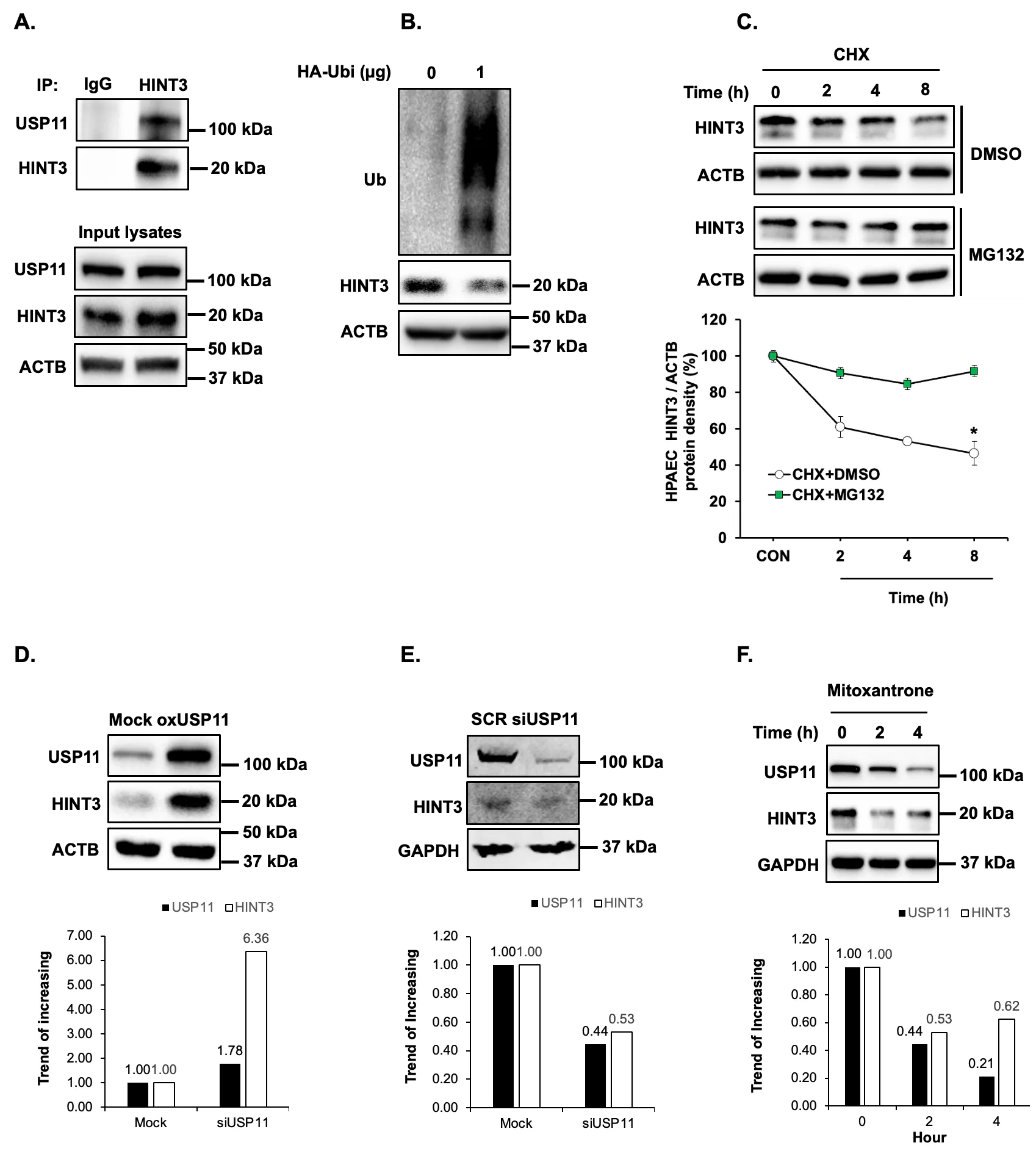. HINT3 is degraded by ubiquitination and USP11 deubiquitinates HINT3 in HPAECs <i>in vitro</i>. (<b>A</b>) Human pulmonary artery endothelial cells (HPAECs) were cultured for 48 h. Cell lysates were harvested and subjected to immunoprecipitation (IP) with either anti-IgG antibody or anti-HINT3 antibody and then immunoblotted with anti-USP11, anti-HINT3, or anti-β-actin (ACTB) antibody. (<b>B</b>) HPAECs were transfected for 24 h with HA-ubiquitin (1 µg, HA-Ubi) plasmid or the control plasmid (empty vector), then collected and assayed by immunoblotting for anti-HA, anti-HINT3, and ACTB (loading control) antibody. (<b>C</b>) HPAECs were pretreated with MG132 for 2 h, and then were treated with cycloheximide (CHX, 20 µg/mL) for 0, 2, 4, and 8 h, to inhibit protein synthesis, and harvested for immunoblotting. The level of HINT3 was set as 100% at time 0, and the percent HINT3 protein remaining after CHX treatment at each time point was calculated accordingly. All bars represent mean HINT3 protein levels ± SEM relative to ACTB expressed as fold-change <i>vs.</i> CON ∗ <i>p</i> < 0.05 <i>vs.</i> CON, <i>n</i> = 3. (<b>D</b>) HPAECs were transfected with USP11 (1 μg, oxHUWE1) plasmid or the control plasmid (empty vector) for 6 h. After media replacement, HPAECs were incubated for additional 72 h. Cell lysates were collected and immunoblotted with anti-HINT3 or ACTB antibody. (<b>E</b>) HPAECs were treated with scrambled (SCR) or HINT3 (20 nM) siRNAs for 6 h, media were replaced with endothelial growth medium (EGM) containing 5% FBS. And then incubated for an additional 72 h. Western blotting was performed for HINT3 or GAPDH protein. (<b>F</b>) HPAECs were treated with dimethyl sulfoxide (DMSO) or USP11 inhibitor (mitoxantrone) for 0–4 h. Western blotting was performed for HINT3 or GAPDH protein.