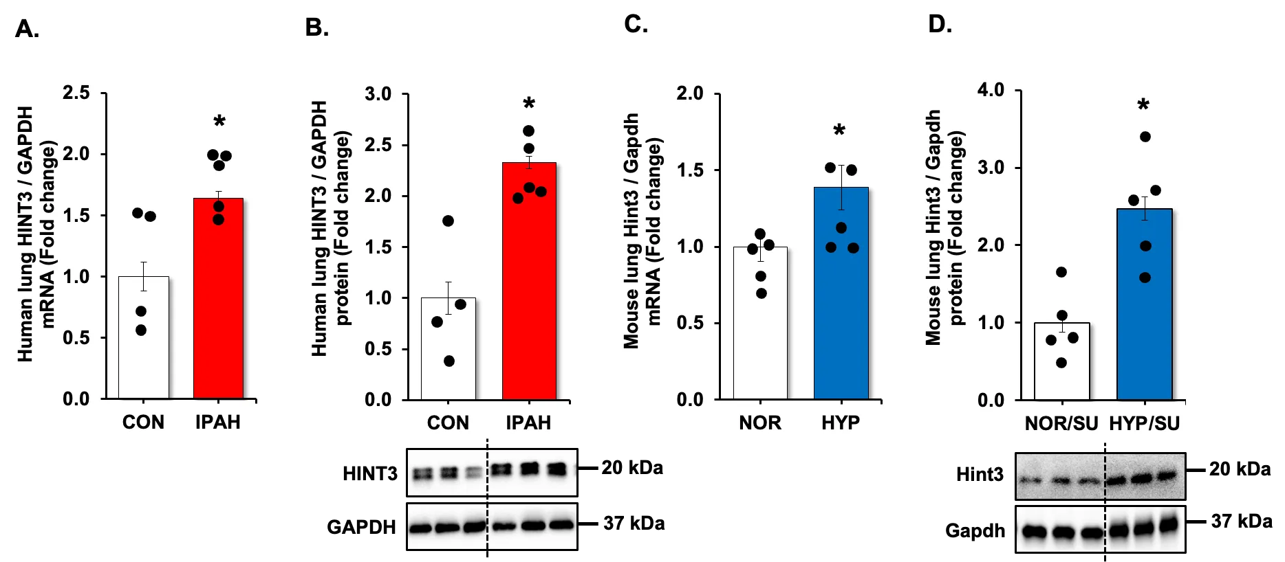 . HINT3 is increased in clinical and experimental PAH samples. (<b>A</b>,<b>B</b>) Fail donor (CON) or idiopathic pulmonary arterial hypertension (IPAH) patient lungs were subjected to qRT-PCR and Western blots. <i>n</i> = 4–5. Densitometry with a representative blot and GAPDH loading control is shown in B. (<b>C</b>,<b>D</b>) Whole lung homogenates were collected from normoxic/sugen (NOR/SU) or hypoxic/Sugen (HYP/SU)-treated mice. Densitometry with a representative blot and GAPDH loading control is shown in D. All bars represent mean HINT3 mRNA or protein levels ± SEM relative to GAPDH expressed as fold-change <i>vs.</i> control (CON) or <i>vs.</i> NOR/SU. <i>n</i> = 5. ∗ <i>p</i> < 0.05 <i>vs.</i> respective control condition.