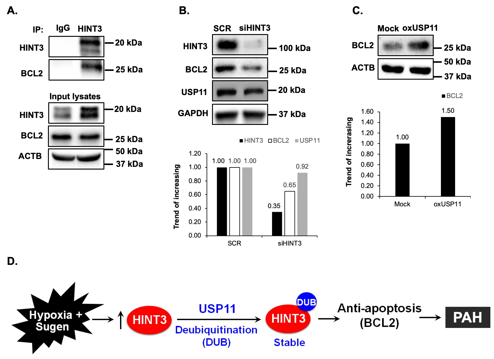 in vivo; (2) however, the balance of ubiquitination and USP11-mediated deubiquitination is a major determinant of HINT3 protein stability; and (3) HINT3 positively regulates the anti-apoptotic mediator BCL2, consistent with the stereotyped finding of apoptosis-resistance in pulmonary artery endothelial cells. Immunoprecipitation assays corroborate interactions between relevant binding partners: USP11-HINT3-BCL2. Therefore, abnormal upregulation of USP11 contributes to hypo-ubiquitination and inappropriate stabilization of HINT3, resulting in downstream activation of BCL2.