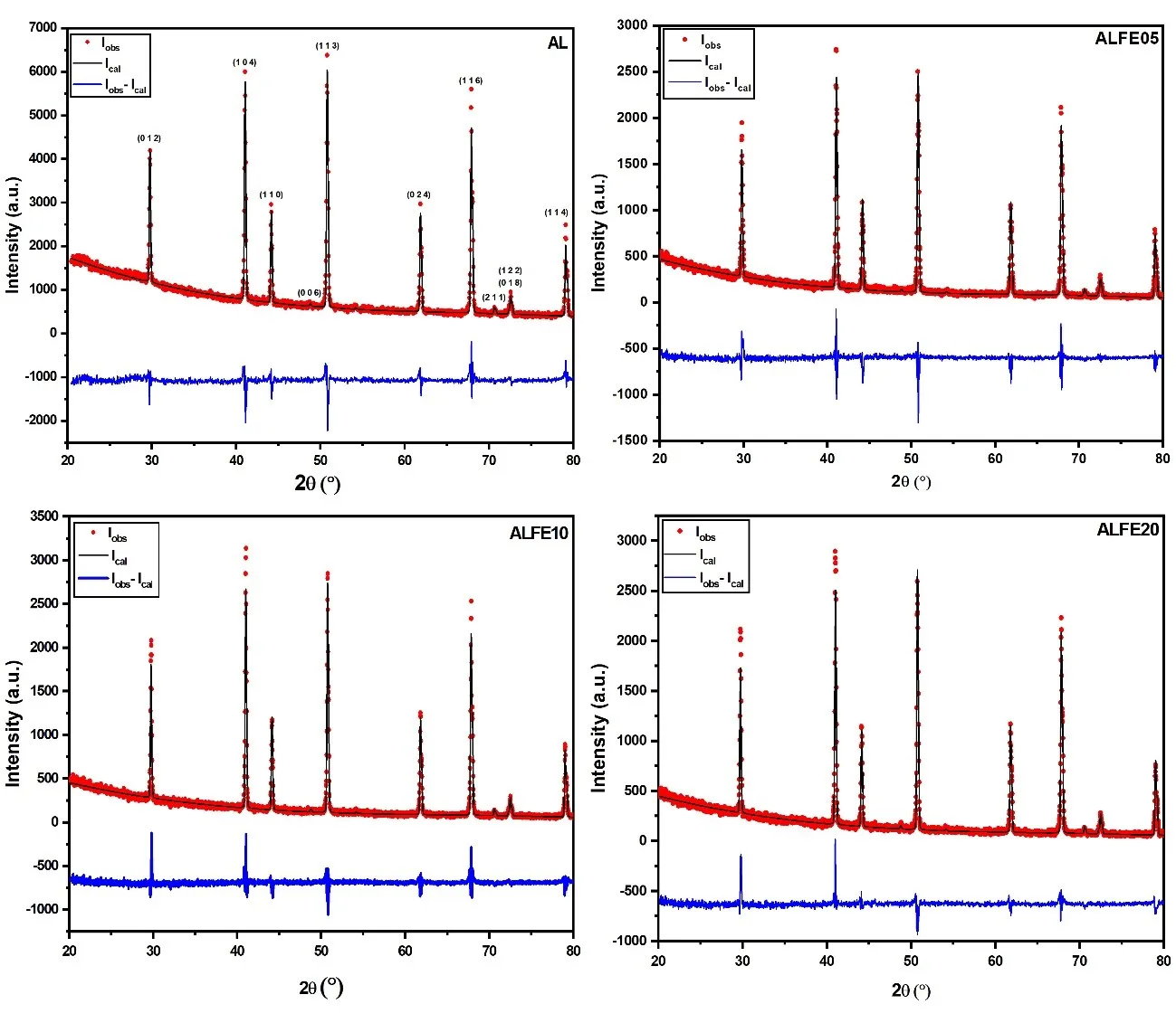 3 content. Specifically, the values of the unit cell parameters for the AL sample were a = 4.759 nm, b = 4.759 nm, and c = 12.995 nm. For the ALFE05, ALFE10, and ALFE20 samples, the parameters showed a small but consistent increase in both the a, b, and c values, with the largest increase in the c parameter. This suggests that the Fe