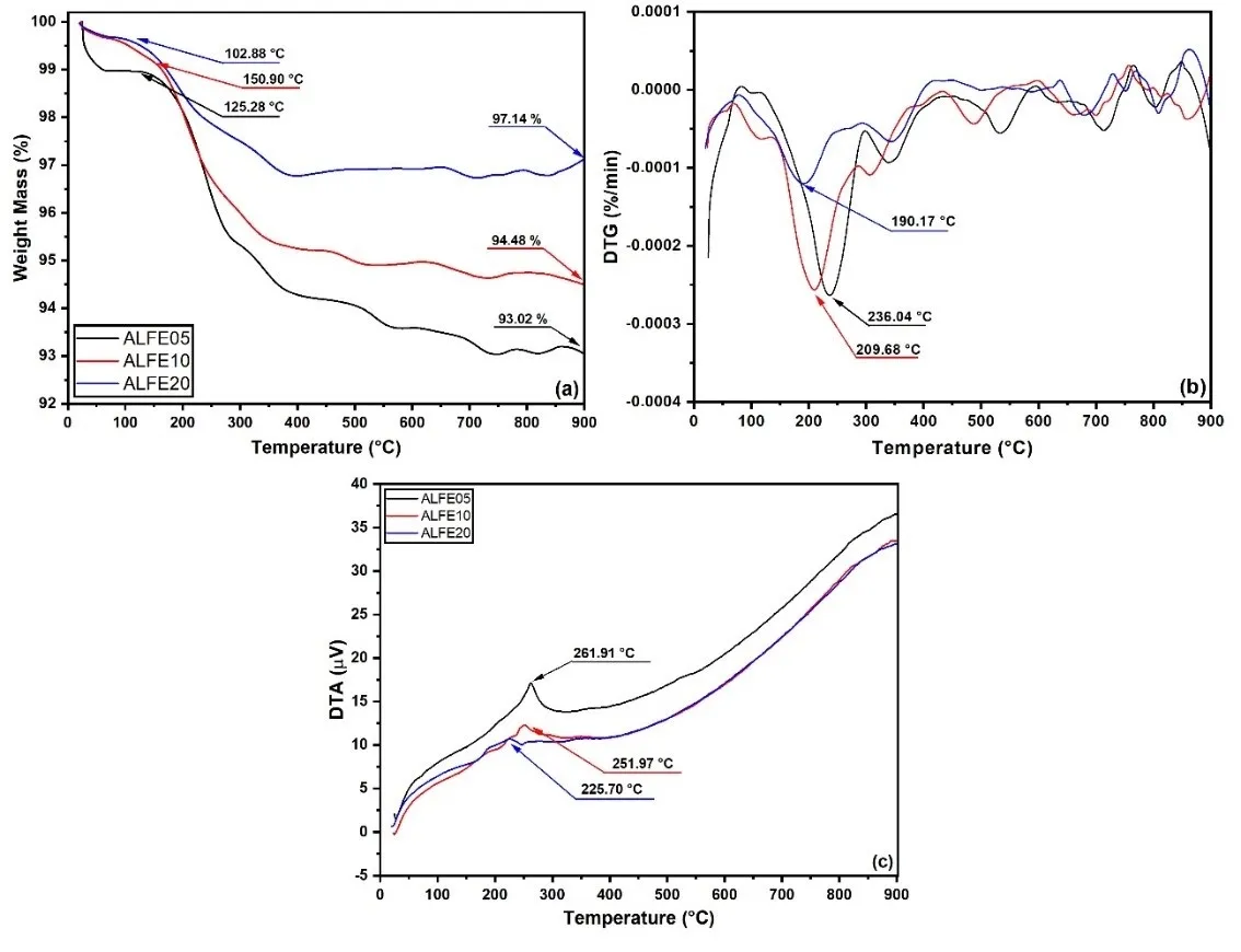 3 in higher contents resulted in a change in the TG curve of the ALFE10 and ALFE20 samples. The sample with 1 wt.% Fe