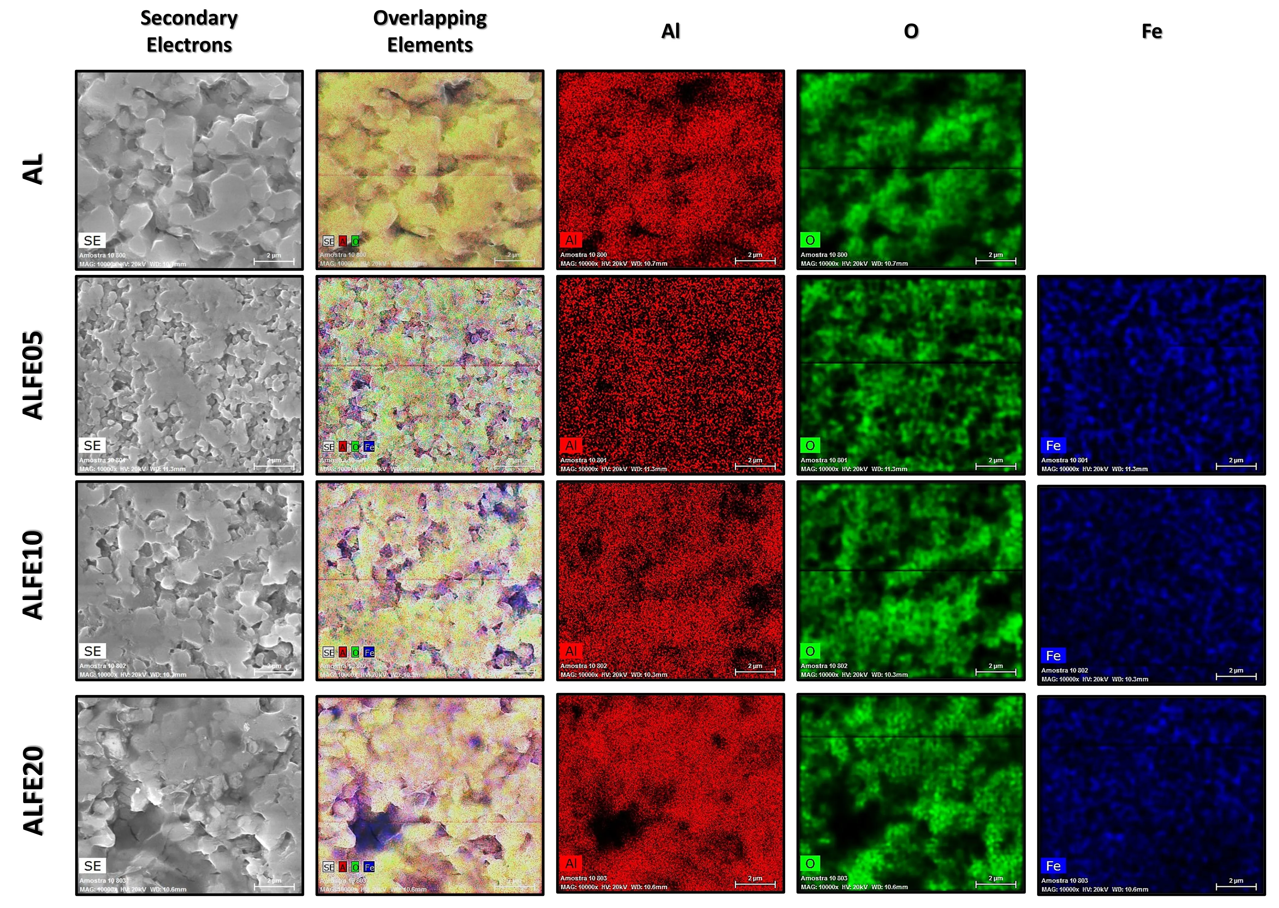 and show the EDX spectra with the compositional map of the sintered samples and the quantification of each present element, respectively. In the AL sample analysis, aluminum and oxygen atoms are observed, as expected for the sample without a sintering additive. On the other hand, the ALFE05, ALFE10, and ALFE20 samples show the presence of iron, highlighted in blue.