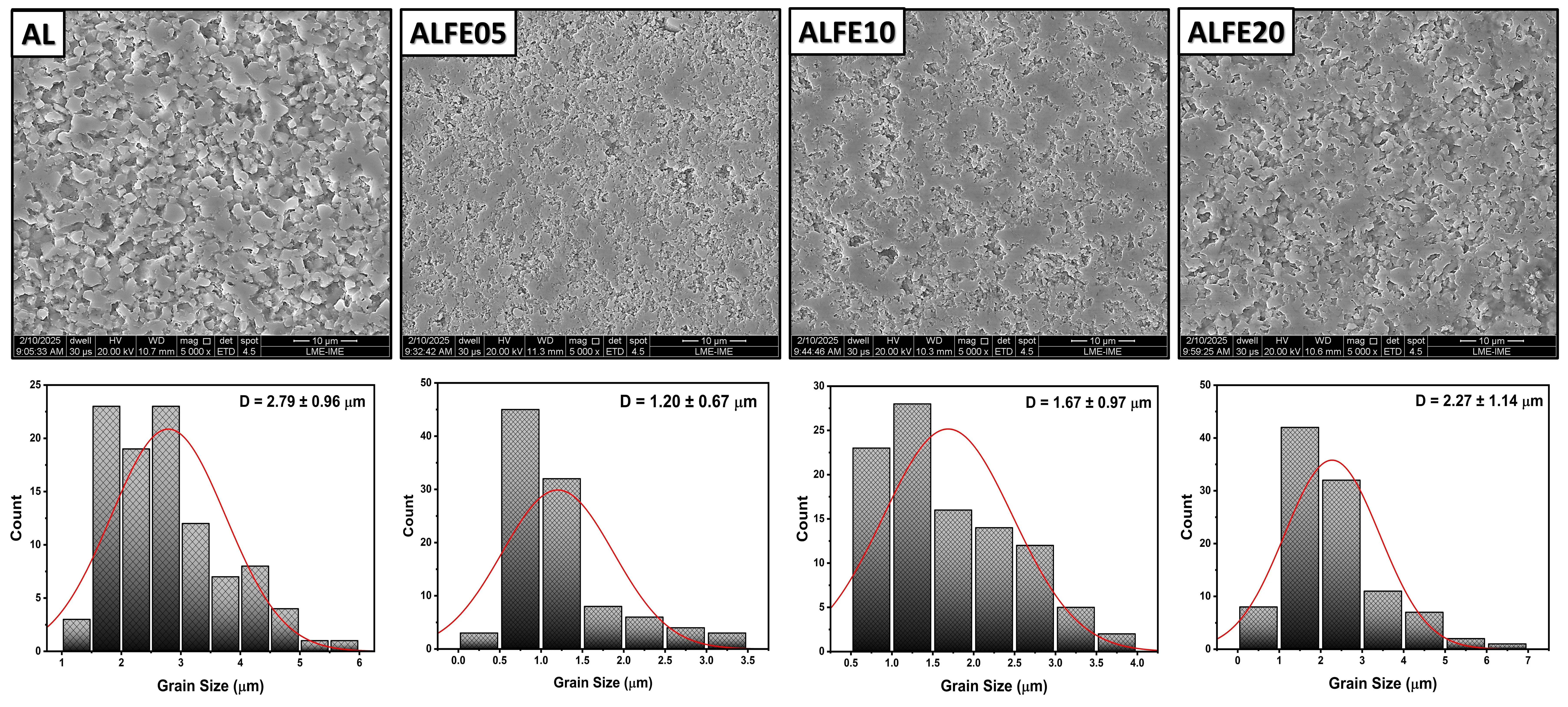3 in contents of 1 and 2 wt.% resulted in larger grain sizes, with ALFE10 and ALFE20 samples obtaining values of D = 1.67 ± 0.97 μm and 2.27 ± 1.14 μm, respectively. The isolation of pores is also highlighted in the ALFE20 group. This sample, which showed the highest densification among the four studied groups, exhibited the largest grain growth. However, the average grain size was still smaller than that of pure Al