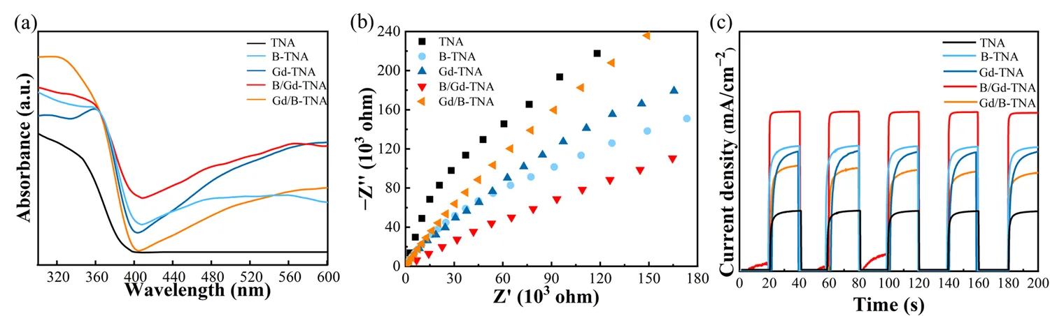 . (<b>a</b>) UV-vis diffuse reflectance spectrum, (<b>b</b>) EIS Nyquist plots of catalytic agent, (<b>c</b>) Transient photocurrent responses of TNA, B-TNA, Gd-TNA, B/Gd-TNA, and Gd/B-TNA.