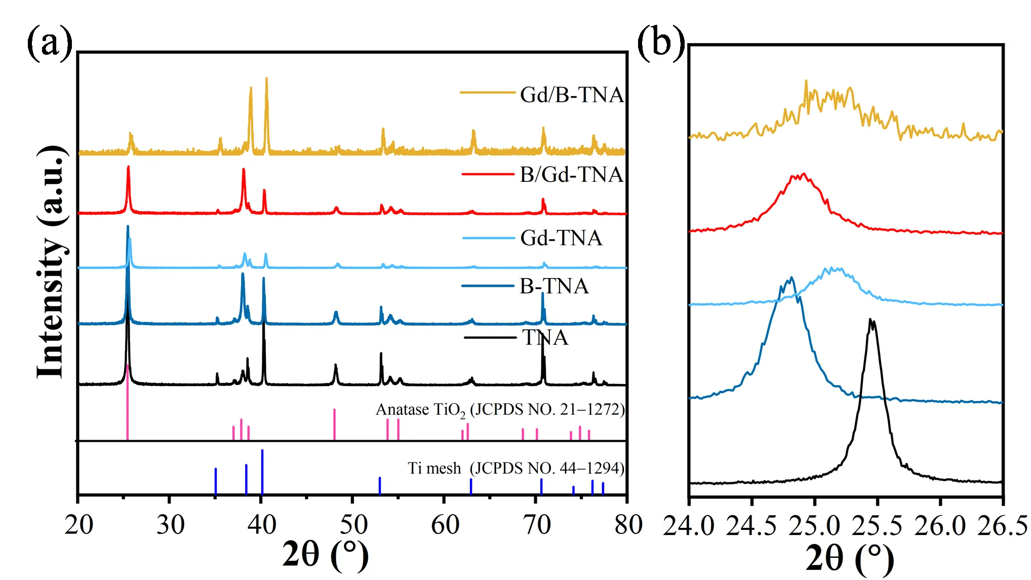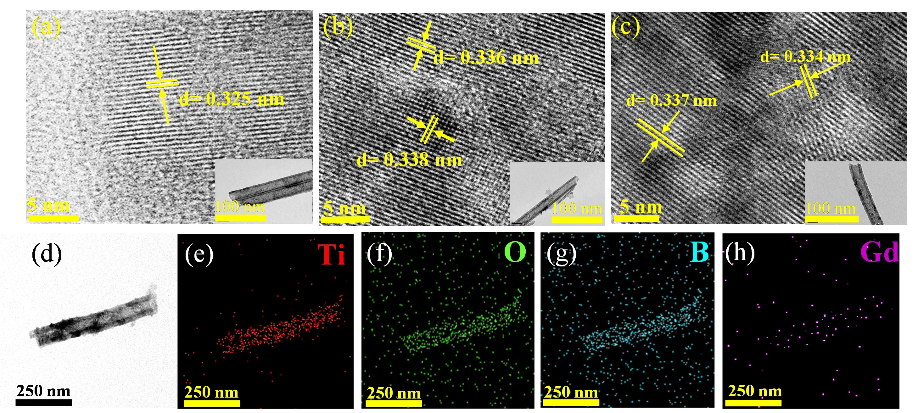 2 for 30 min. Finally, the as-obtained B/Gd-TNA precursor was ultrasonicated with ethanol and deionized water for 15 min. Then, the B/Gd-TNA was obtained by annealing at 450 °C for 2 h in a tube furnace. As for Gd, B co-doped TiO