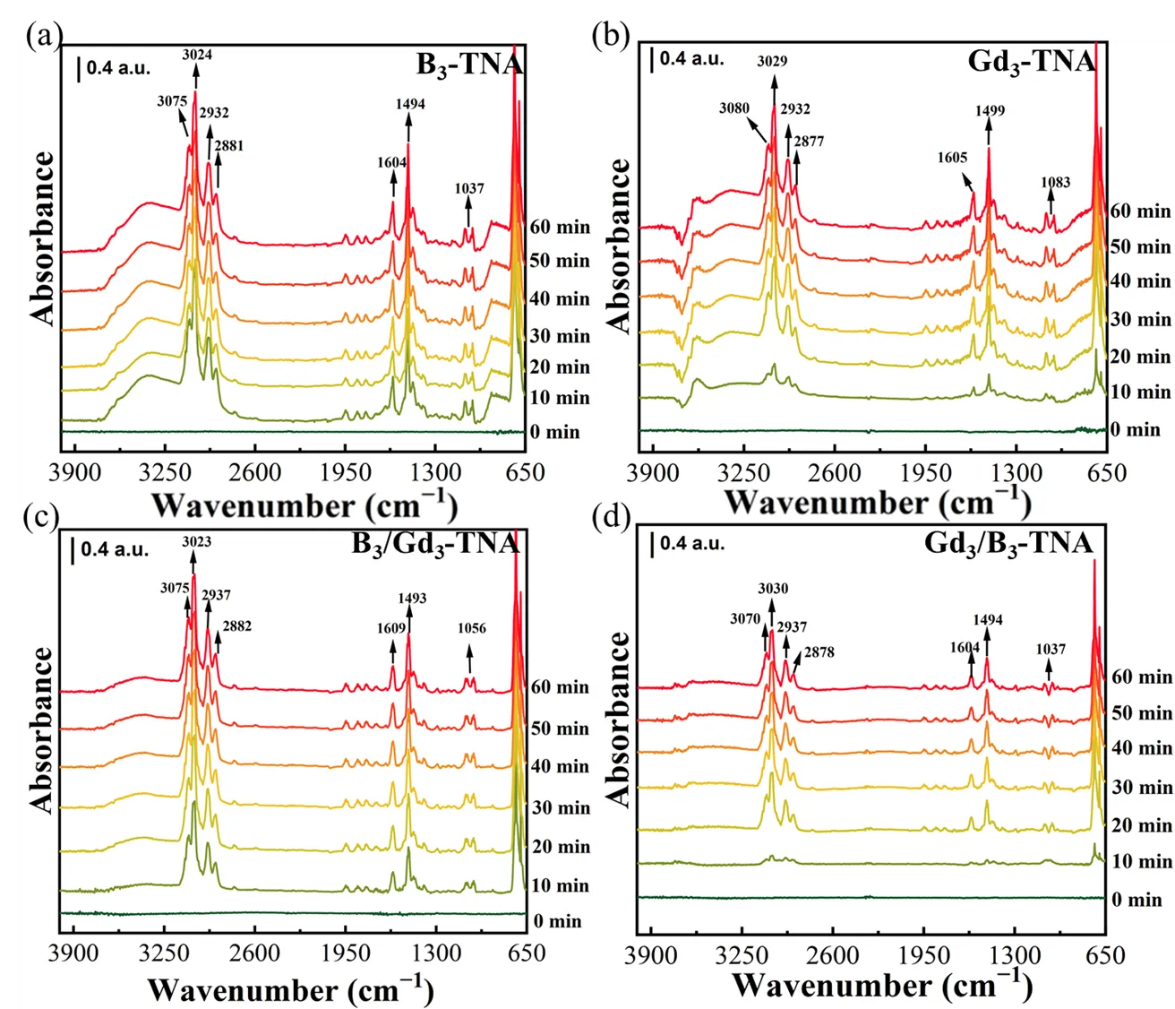 . <i>In-situ</i> DRIFTS spectra for the adsorption of toluene on (<b>a</b>) B<sub>3</sub>-TNA (<b>b</b>) Gd<sub>3</sub>-TNA (<b>c</b>) B<sub>3</sub>/Gd<sub>3</sub>-TNA (<b>d</b>) Gd<sub>3</sub>/B<sub>3</sub>-TNA.