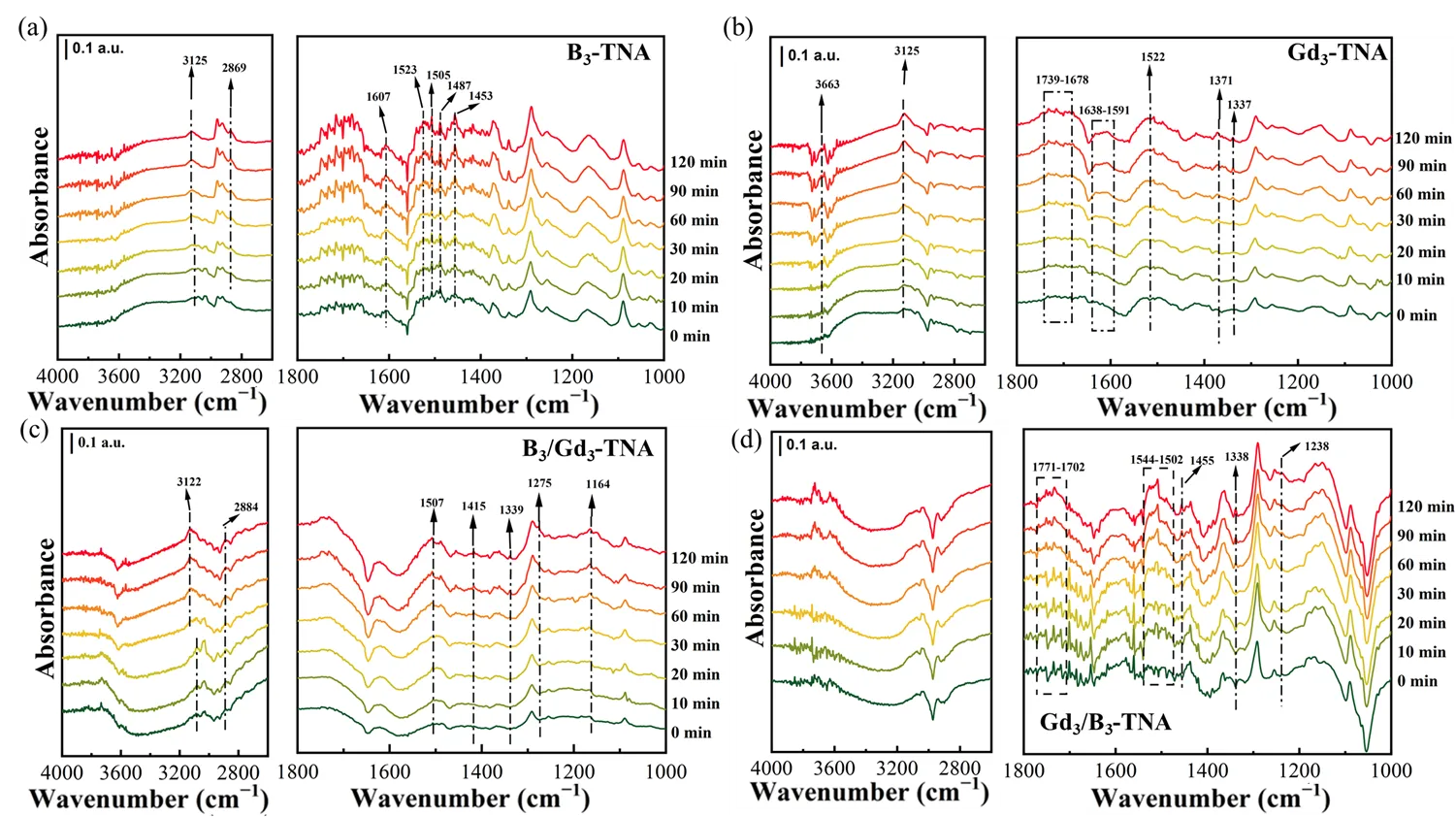 , respectively. The DRIFTS spectra of other B and Gd concentrations in B/Gd-TNA and Gd/B-TNA were shown in