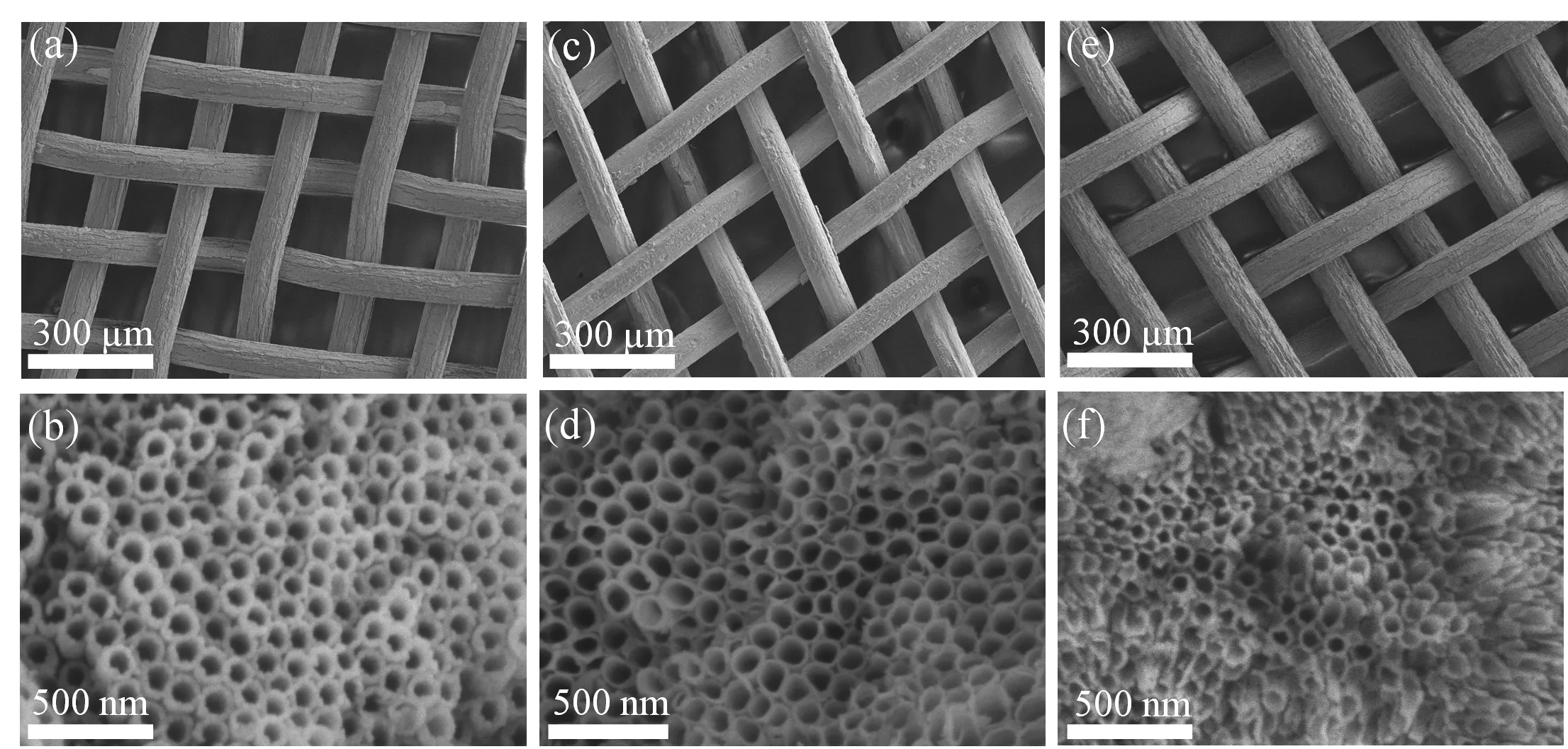 4F in an aqueous ethylene glycol solution with 2 vol% water. In the first-step anodization, the Ti mesh was anodized at 50 V for 1 h, the pretreated Ti would grow on the mesh surface, and then the grown nanotube layer was removed by sonicating in ethanol and deionized water. Whereafter, the second-step anodization was conducted at 50 V for 30 min. The as-obtained TiO
