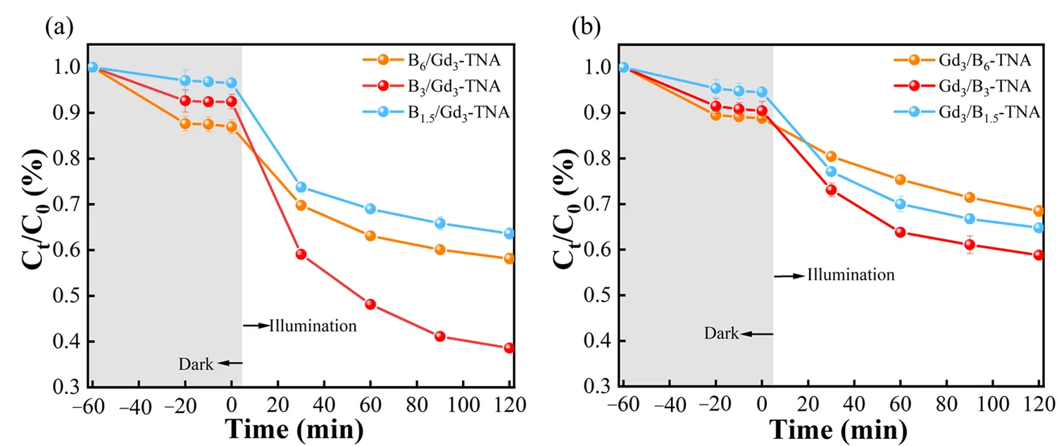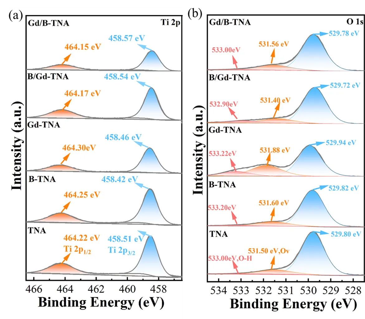 In-situ DRIFTS spectra results show that the doping order of B and Gd also affects the catalytic performance of the catalyst. The introduction of Gd atoms first results in the reduction of oxygen vacancies and the collapse of the nanotube structure, which leads to the lower photocatalytic degradation performance of Gd/B-TNA.