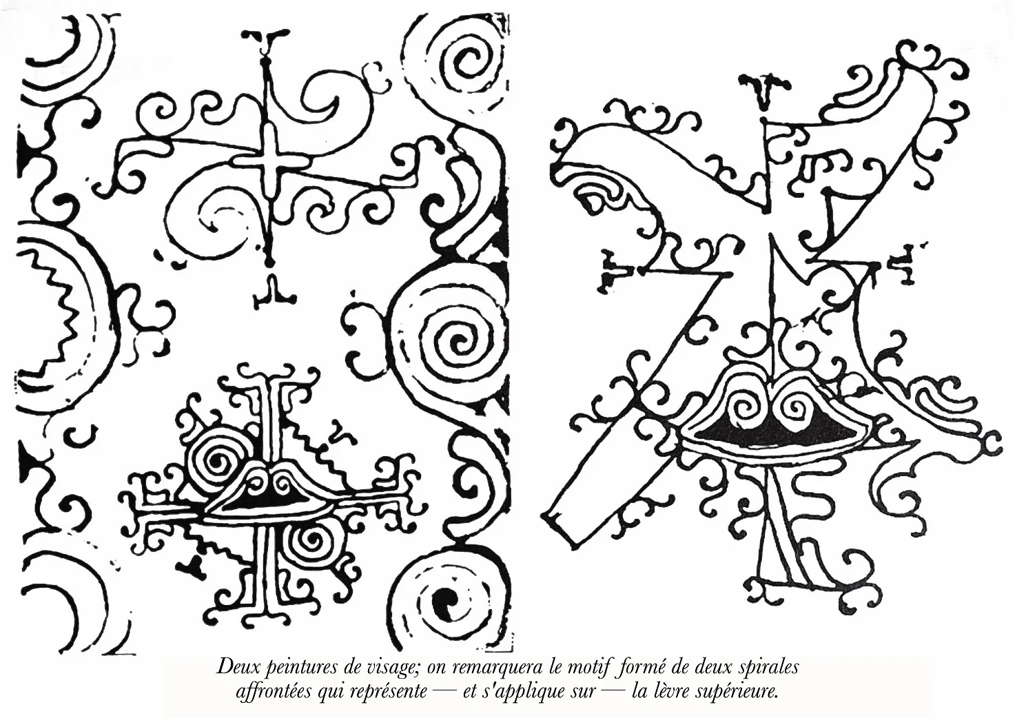 . Face paintings (Caduveo) featuring a motif of two opposing spirals representing the upper lip. [