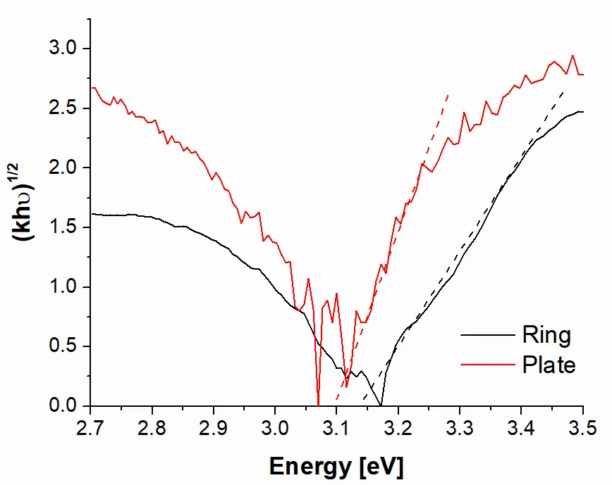 Eg) of the samples through Tauc plots, extrapolating to zero a linear fit from a plot of (