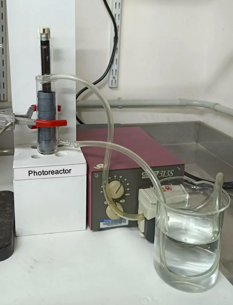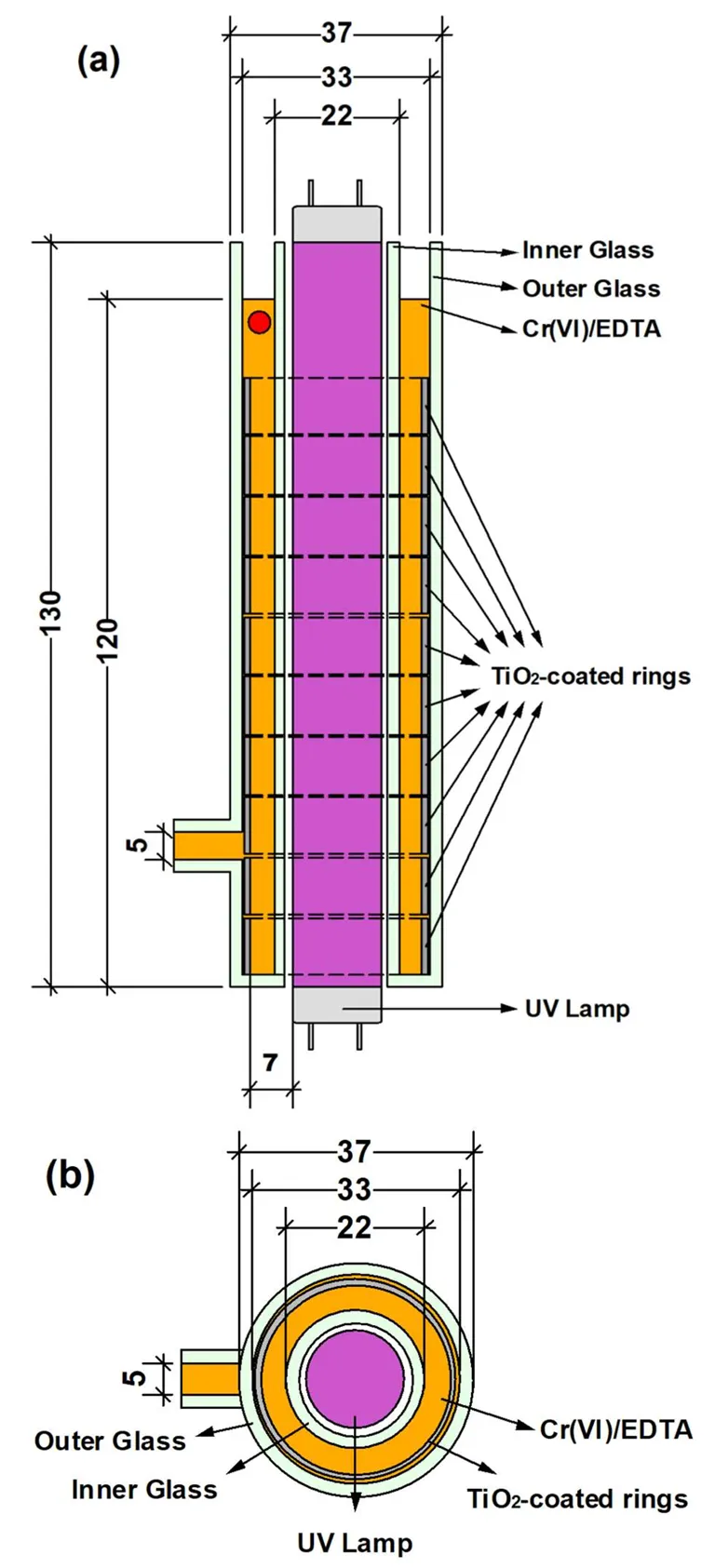 The photocatalytic reactor performance has to be tested with a suitable pollutant system. Several works of our group have shown that the Cr(VI) reduction in the presence of ethylenediaminetetraacetic acid (EDTA) as a sacrificial synergetic agent is a very good and rapid system to compare the efficiency of different photocatalysts and the loss of activity after their reuse (e.g., [
