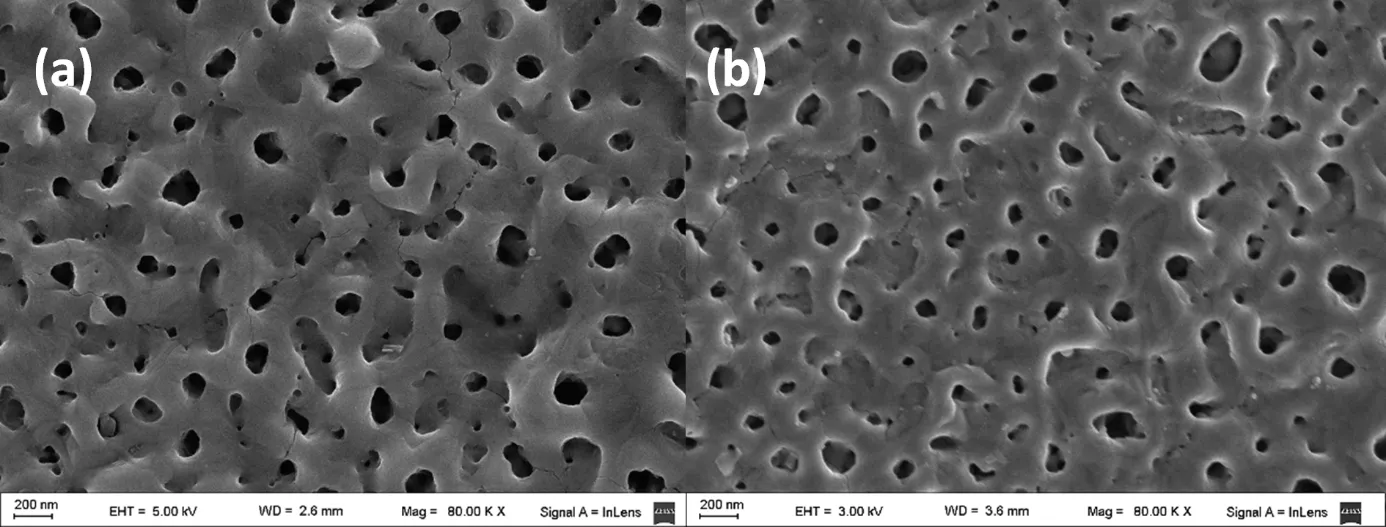 2-coated plate and ring) was observed by scanning electron microscopy (SEM) using Carl Zeiss equipment (model Supra 40, Oberkochen, Germany). The images of the surface were analyzed using the ImageJ software (1.54g version). An average pore diameter was calculated, assuming circular pores, and the percentage of area covered by the pores, named as porous fraction, was calculated [