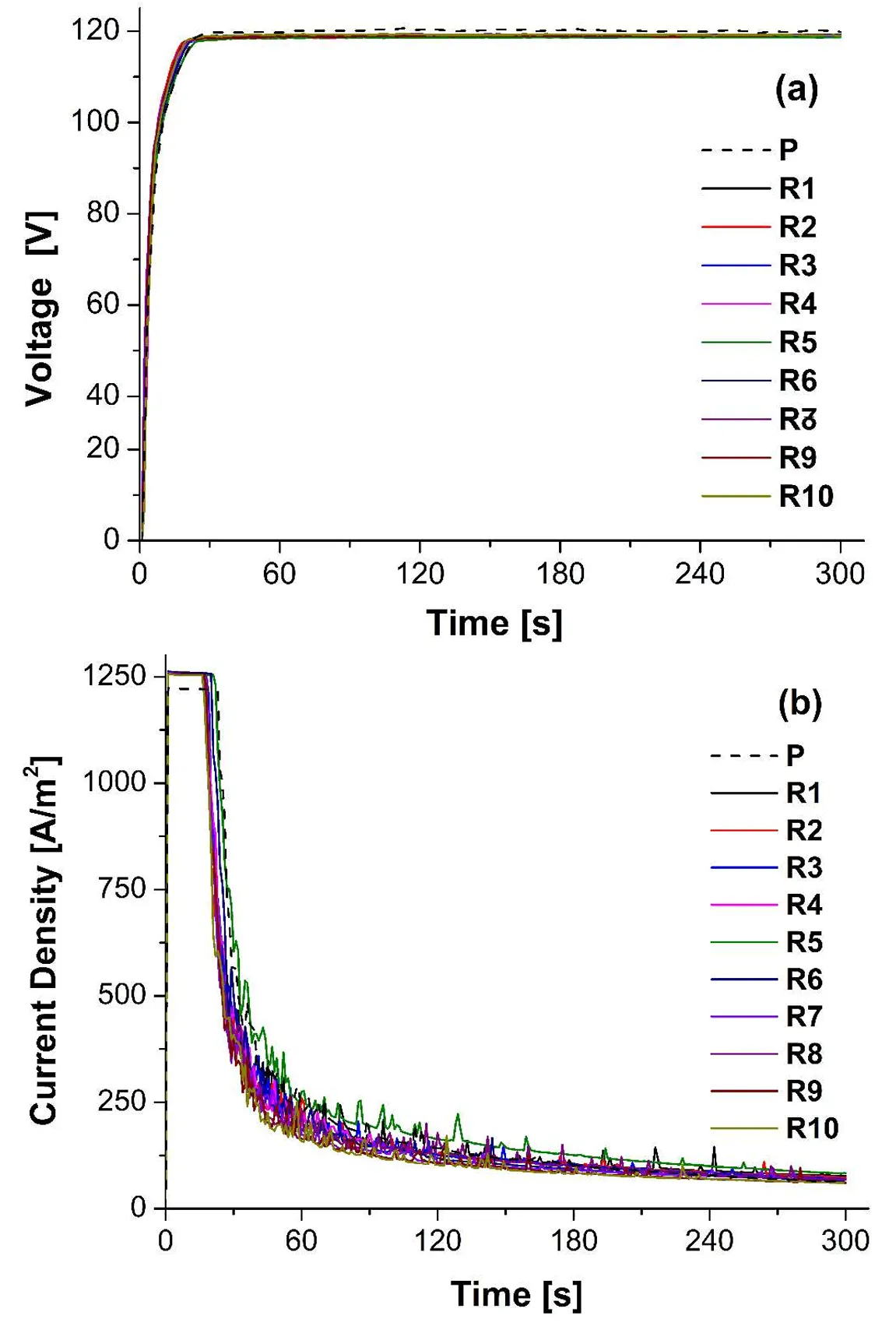 −2) up to a cell voltage of 120 V and then at constant voltage (potentiostatic, 120 V). 1 M H