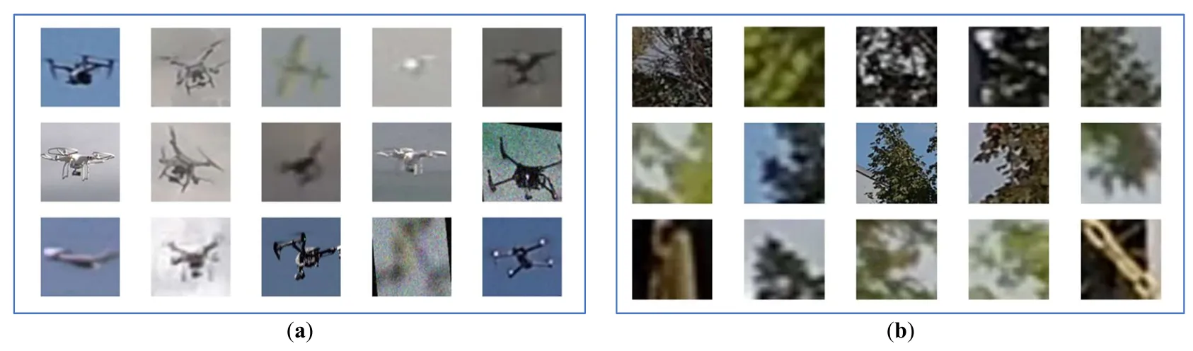 . (<b>a</b>) Samples from ‘drone’ class in training dataset, (<b>b</b>) Samples from ‘not-drone’ class in training dataset.