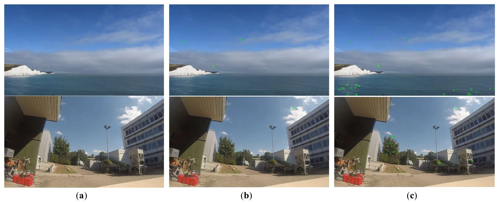 Although background subtraction is a well-established technique for detecting medium- or large-sized moving objects, it is rarely utilized in drone detection. This underuse stems largely from drones’ small size and frequent appearance in complex, dynamic environments, where background subtraction methods must handle varied illumination, adapt to moving elements, and accurately segment tiny objects in motion. Most drone detection approaches each frame independently, overlooking temporal context that could improve accuracy. A tracking algorithm is typically employed alongside object detection when spatiotemporal information is incorporated. However, if the drone’s visual cues are weak, sometimes imperceptible even by the human eye, temporal cues become critical in confirming a drone’s presence.