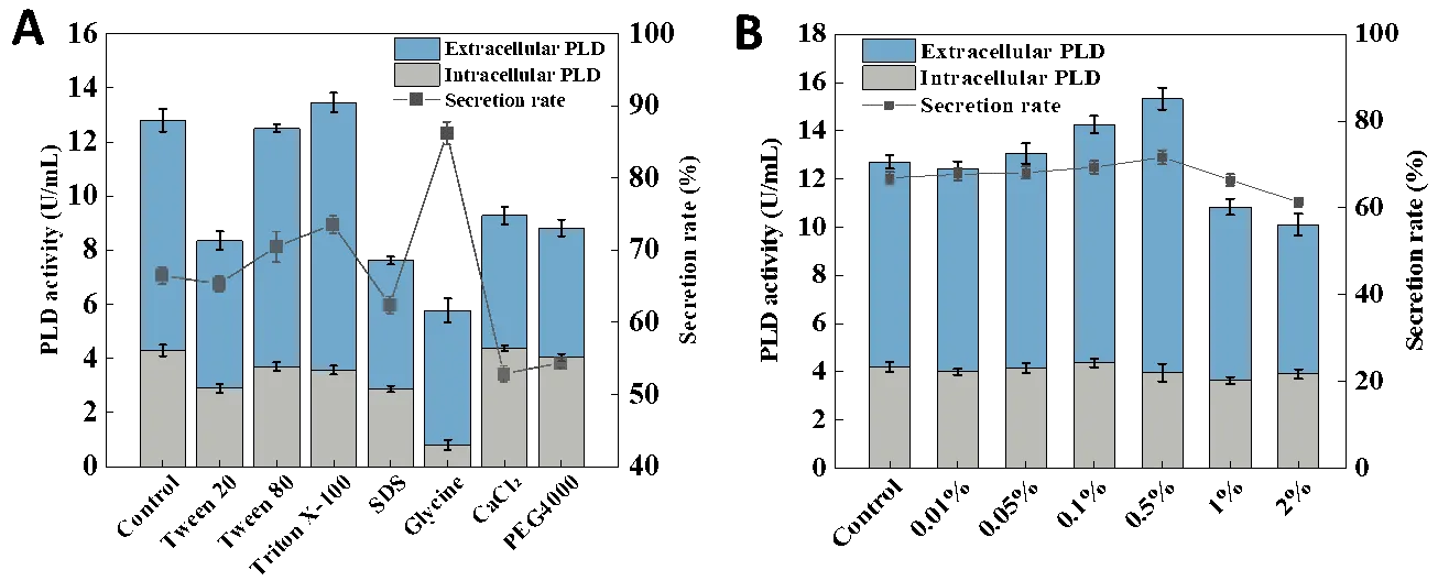 E. coli. On this basis, the effect of cell membrane permeability on the secreted production of PLD was explored via supplementing surfactants into the medium. Combined with the genetic and fermentation optimization, the extracellular PLD activity finally reached 33.26 U/mL in the bioreactor, which was the highest reported so far. Our work demonstrated the potential of