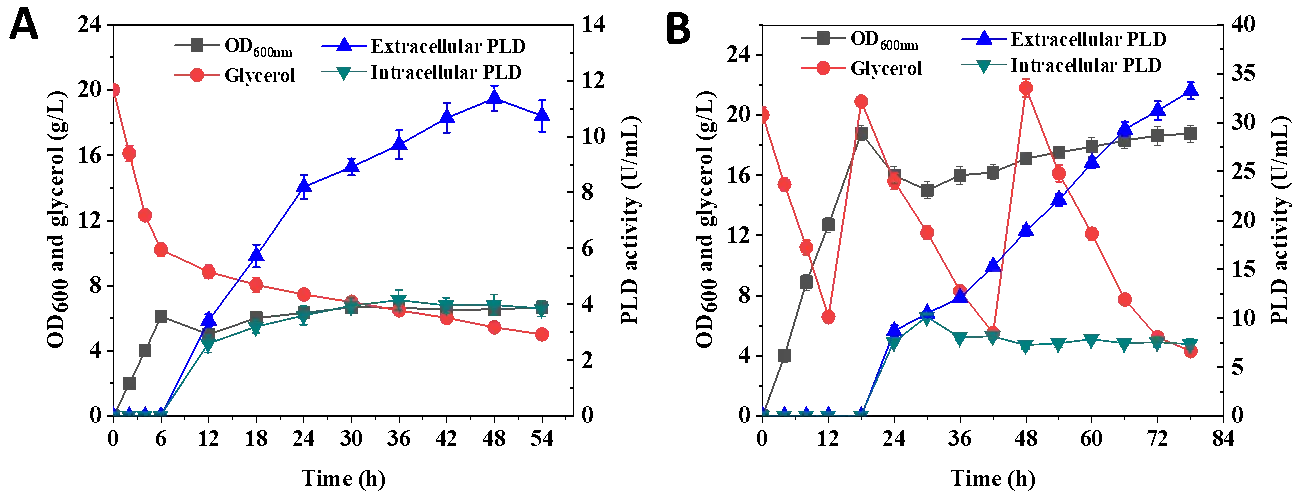 2+) could alleviate cell growth inhibition and significantly increase the synthesis of PLD. After the optimization of the fermentation process, the yield of PLD reached 1100 U/mL in the bioreactor, which is the highest reported intracellular accumulation of PLD in a cell factory at present [